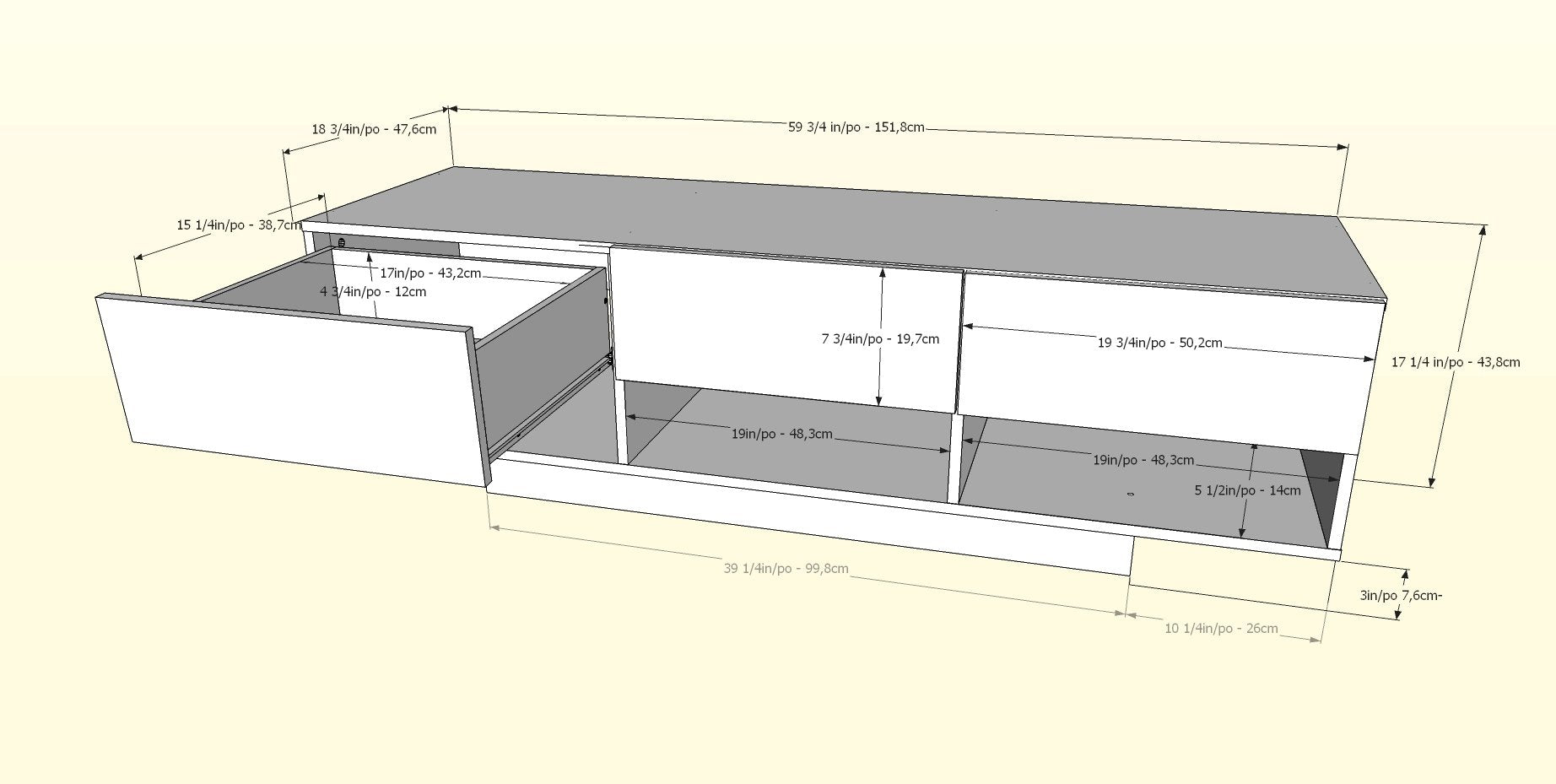 - 3 storage drawers on metal slides and 3 open spaces for electronic components