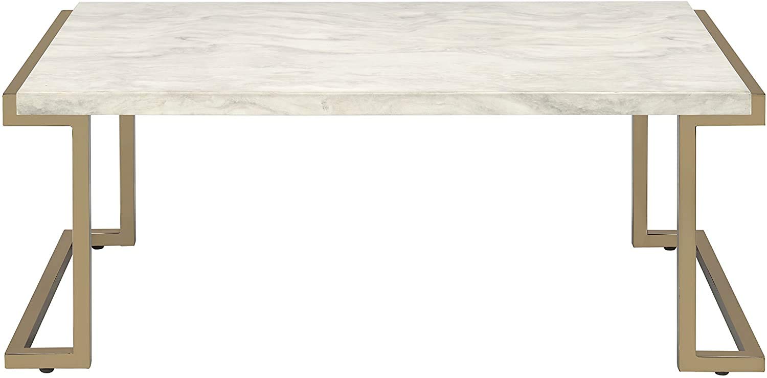 - Elegant Simple Style This modern coffee table achieves a chic modern design with its smooth top, and artificial marble paper veneer, and beneath the table top is a carefully designed champagne colored metal base, achieving a great balance between design and functionality. Good balance. The overall presentation is fashionable and elegant, adding a strong design flavor to the space and perfectly integrating with the decoration style of your home.