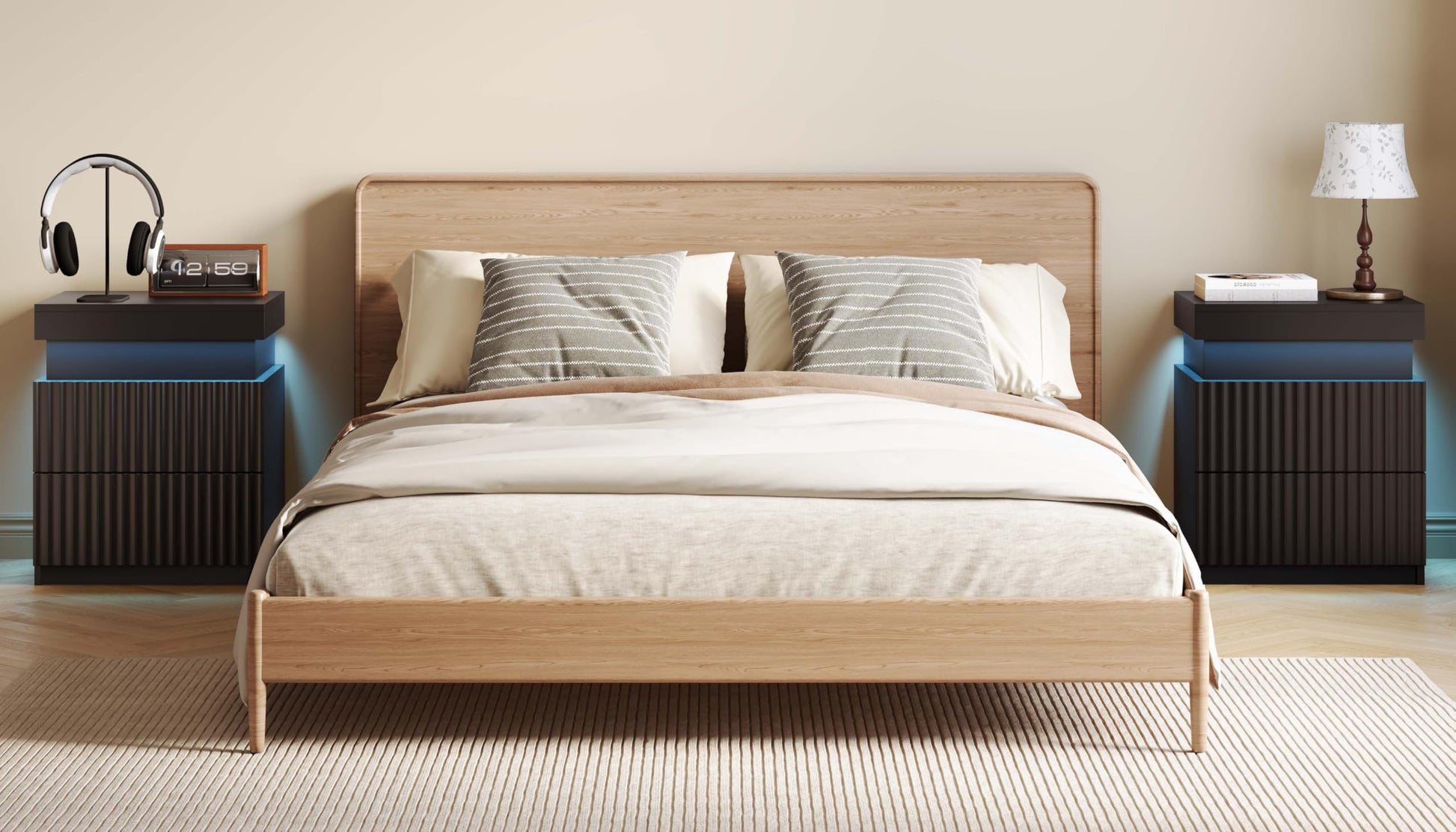 - The bedroom night stand set built-in RGB LED strip light system supports APP Bluetooth and remote control. You can freely set the color, brightness and mode (static, flashing, jumping and fading), design your light show to your heart's content. Makes your life smarter, and you will definitely fall in love with our design.