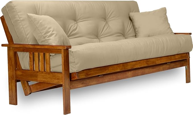 - Complete futon set; includes a futon frame and made in USA solid covered tufted futon mattress