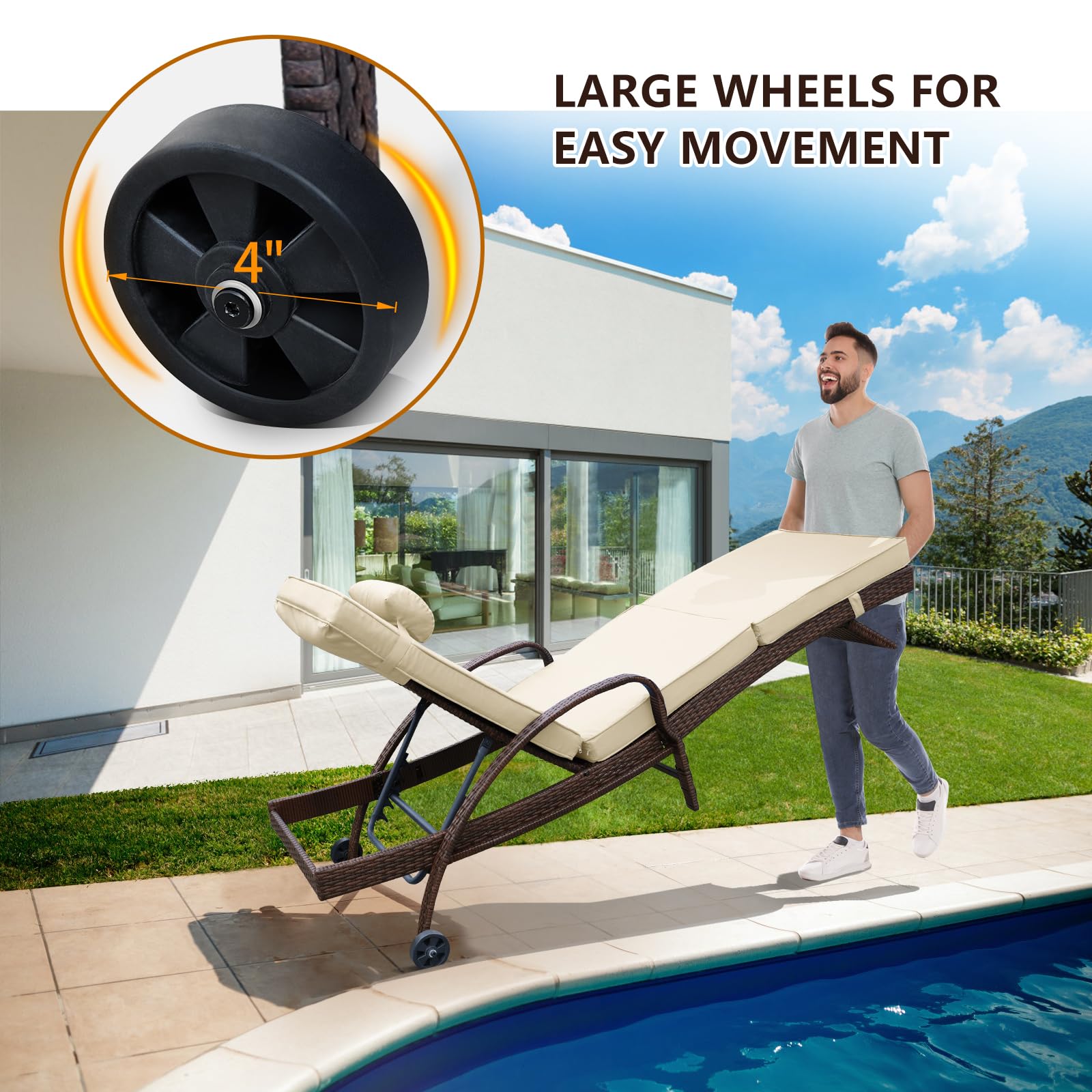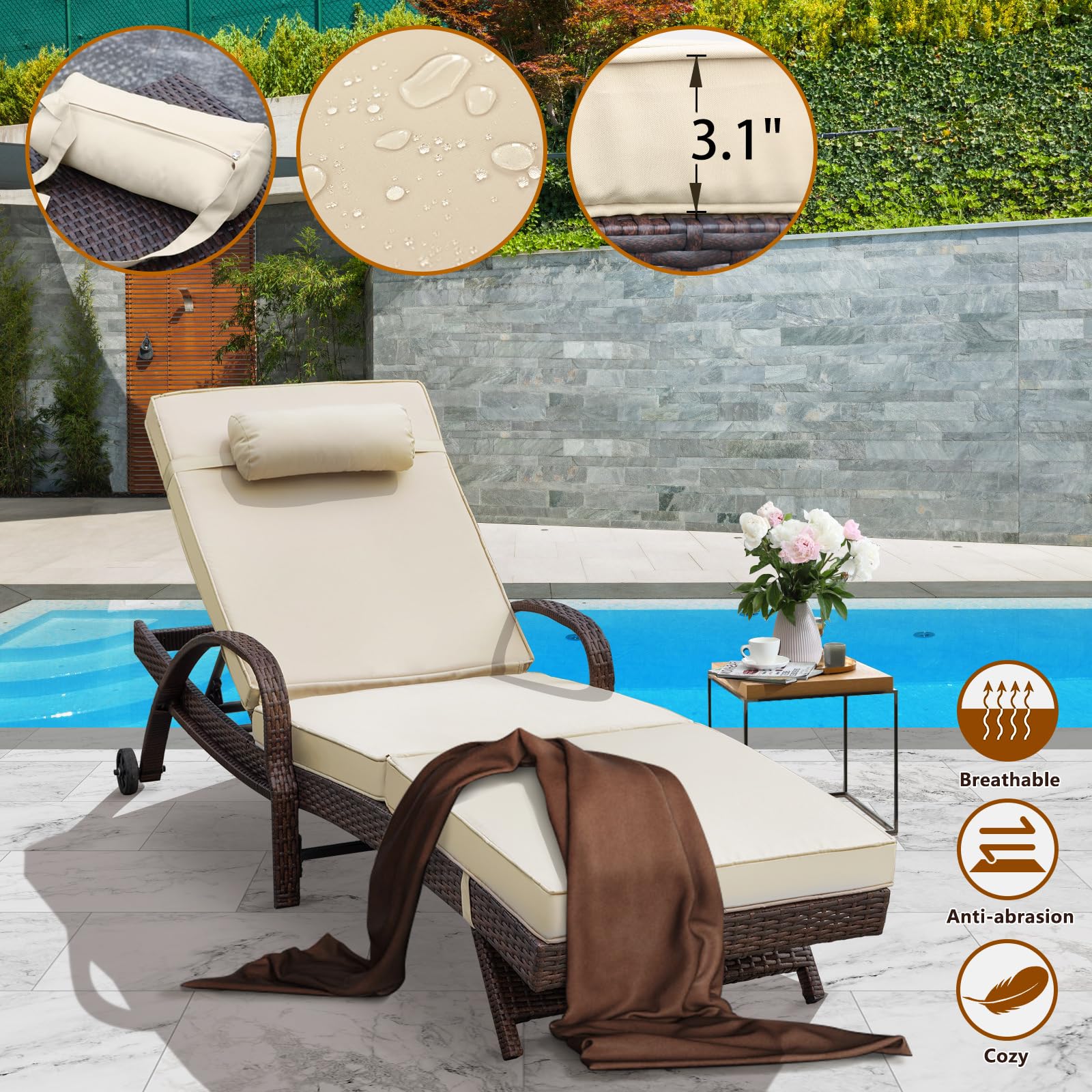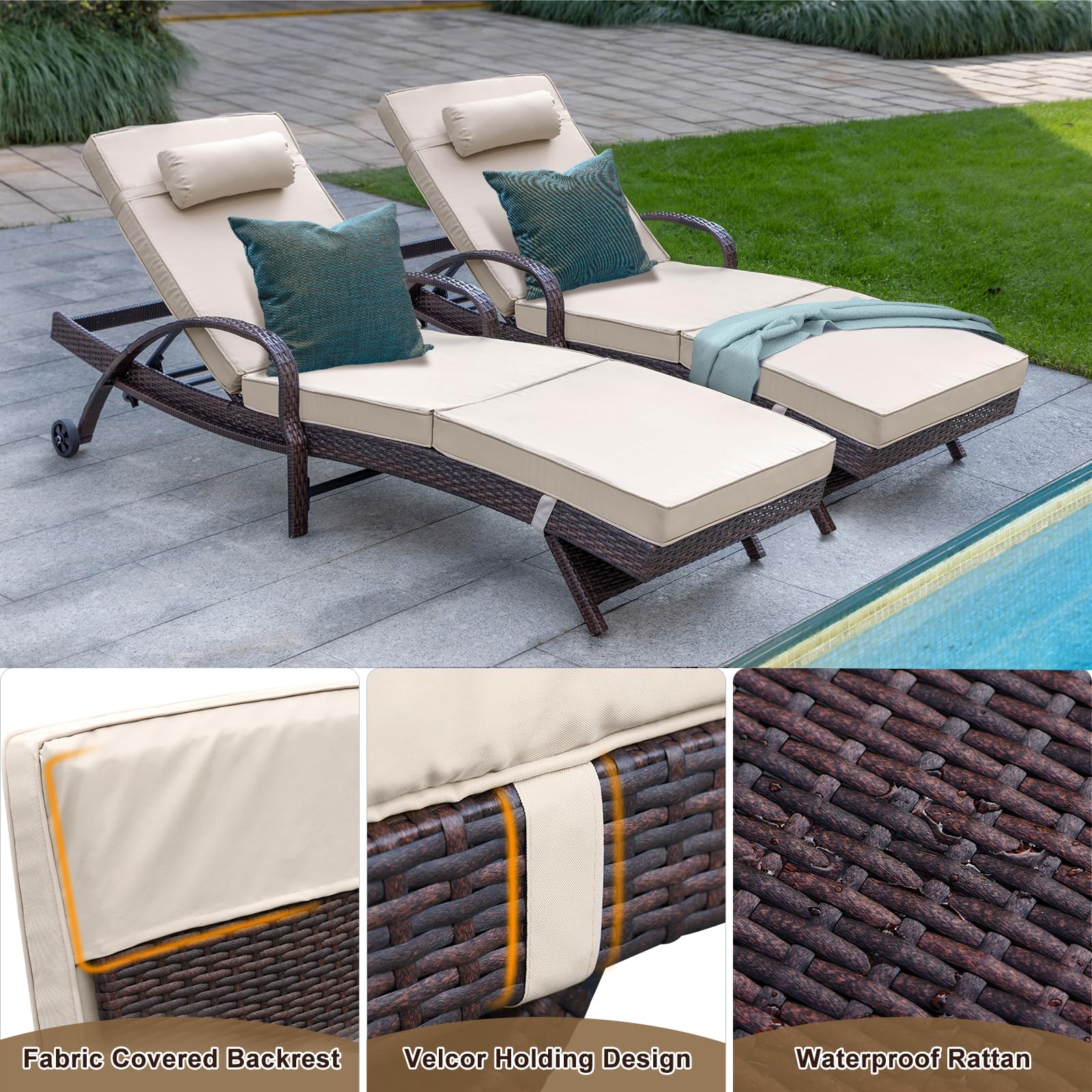 Outdoor Lounge Chairs Set of 2 Beach Wicker Chaise Lounge with Wheels, Cushion