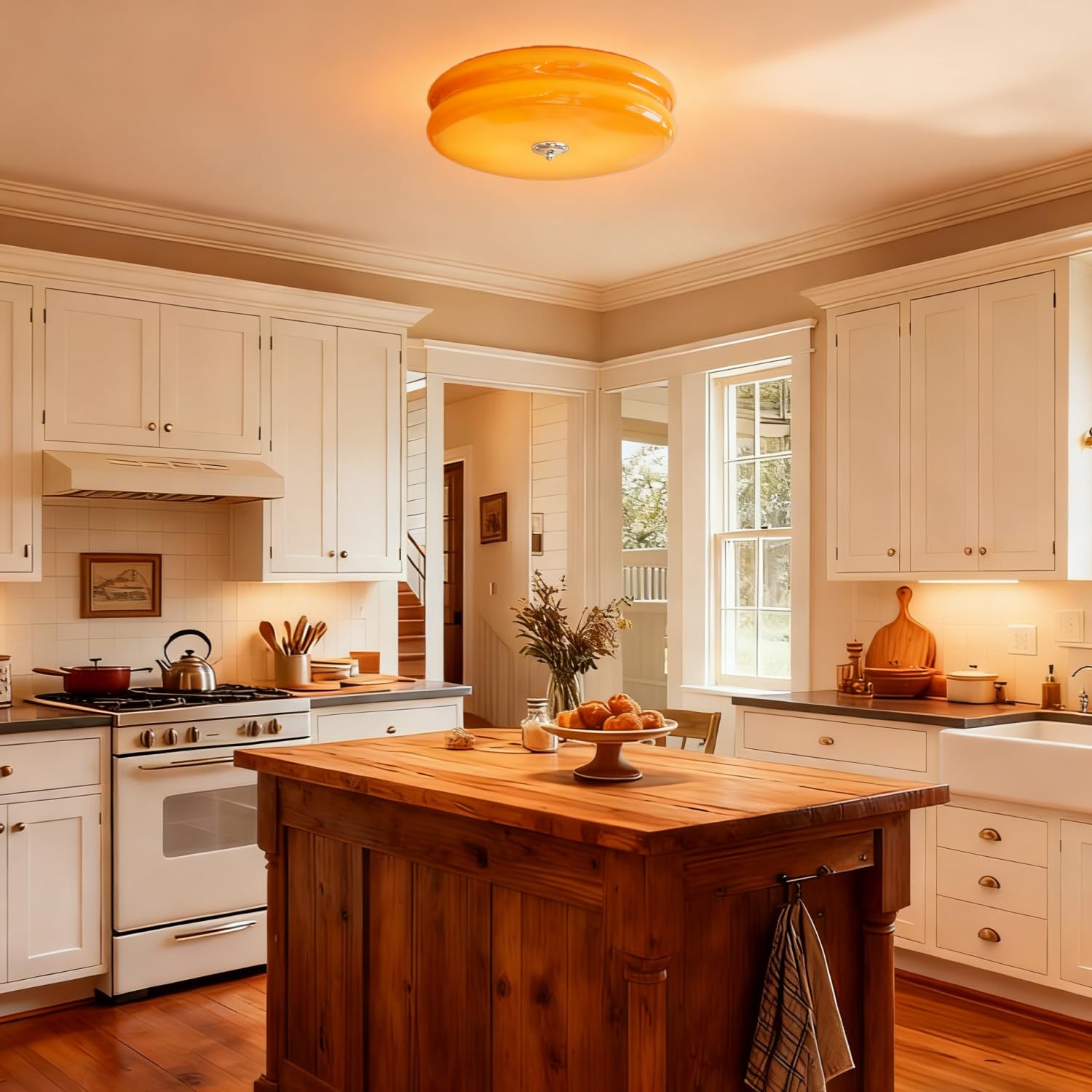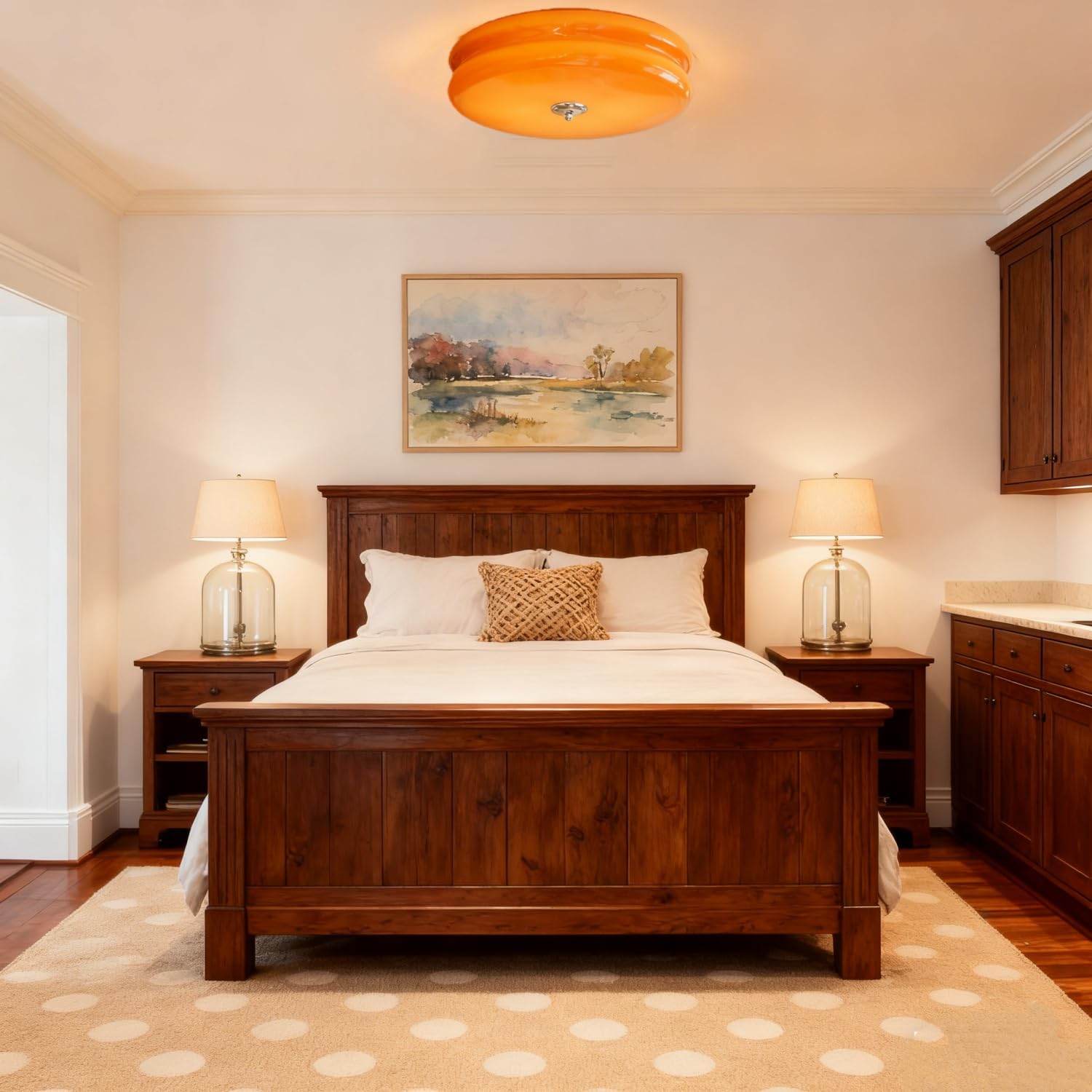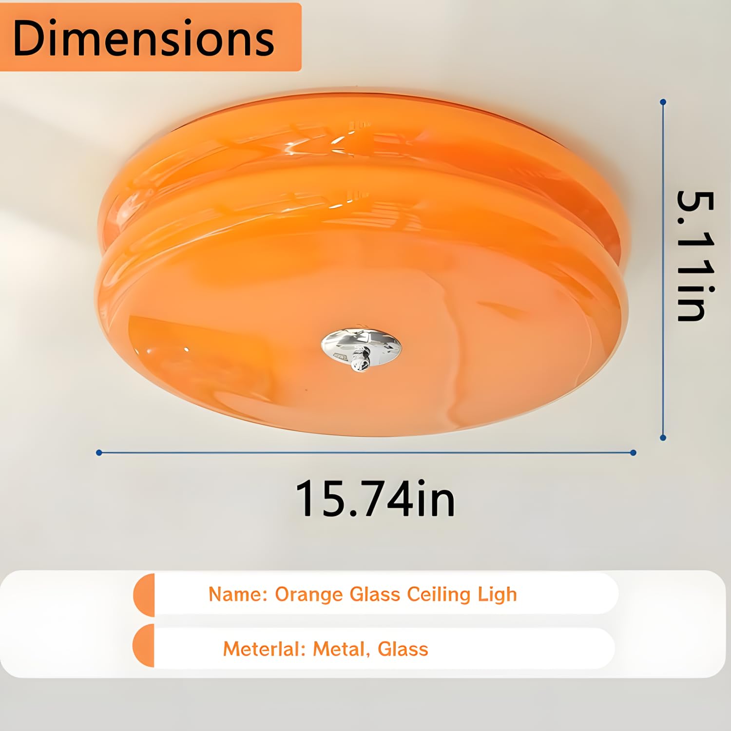 Crafted with premium materials and a sleek round profile, this ceiling light fixture seamlessly blends form and function. The translucent orange glass diffuses light beautifully, creating a soft, welcoming atmosphere while the LED technology ensures long-lasting performance and reduced energy consumption.