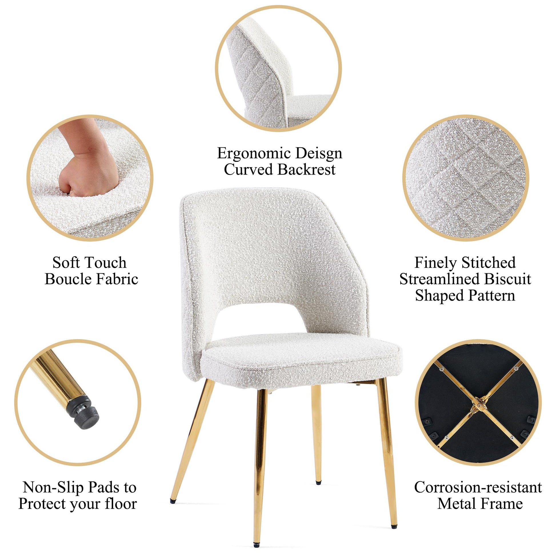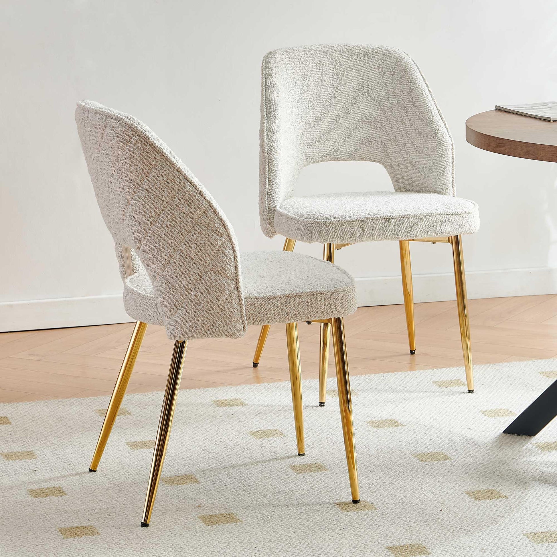- Charm and grace The cut-out detail on the chair backrest, reinterprets the homely style with its curving shapes. The metal frame supports the comforting well padded seat, upholstered in soft boucle for a nice seating experience.