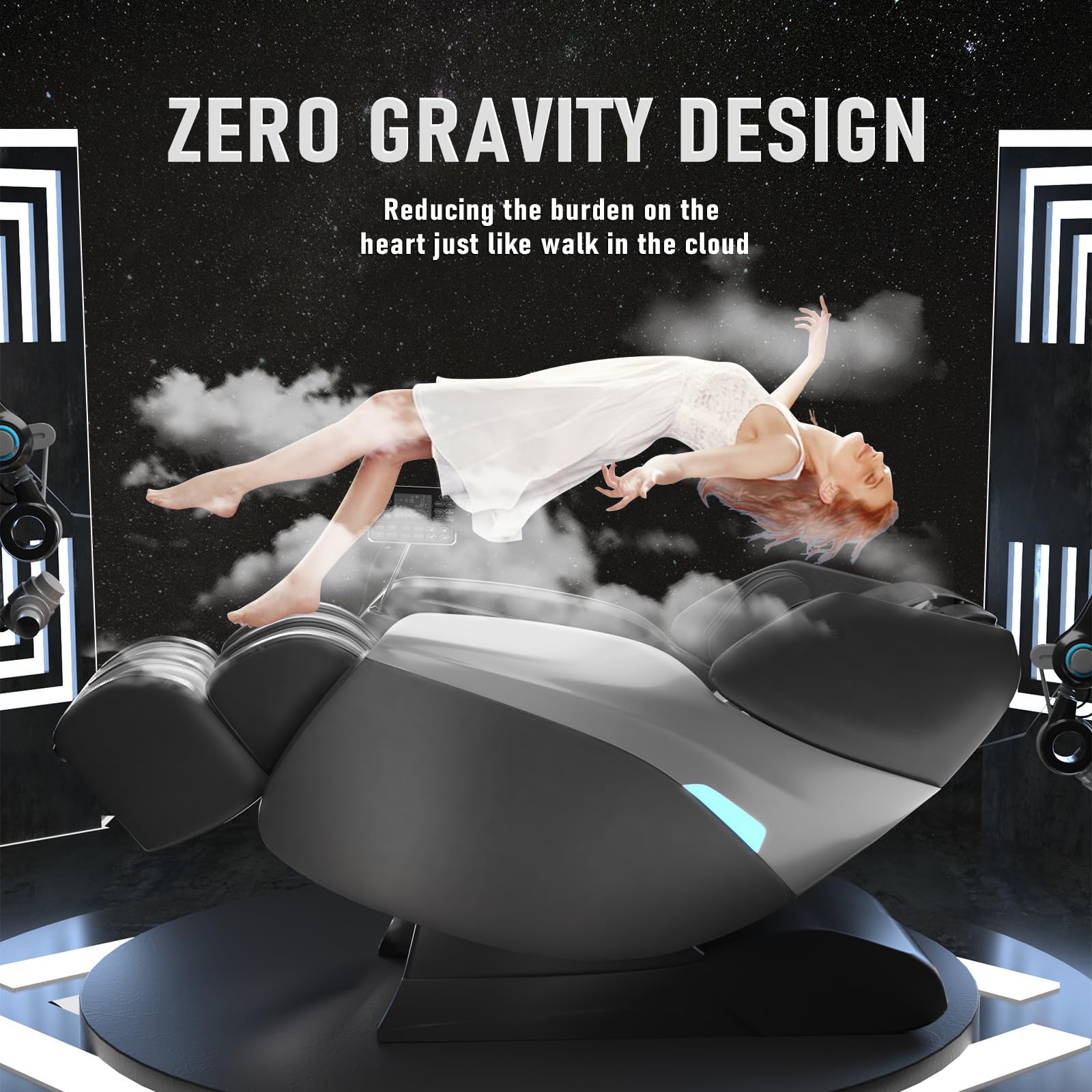 - The zero-gravity massage chair floating function makes you seem to be swimming in the starry sky helps to reduce the weight of the spine and heart load, and stimulates the circulation of the limbs. Additionally, this massage chair was designed after fully considering the height and weight of most Europeans and Americans. Height limit: 6.2 feet, Weight limit: 330 pounds.