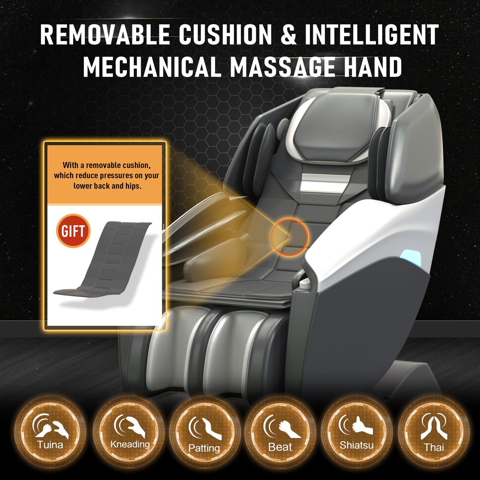 - Our full body massage chair offers 6 types of massage techniques and 9 automatic modes, 6 massage techniques-rolling, kneading, Tai, Tapping, Clapping, Shiatsu and acupressure. 9 automatic modes-president massage, queen slimming, neck and shoulder relaxation, Waist soothing, body stretching, comfortable sleep, Thai-style stretching, fatigue recovery, and pain relief, which can meet different kinds of massage need.