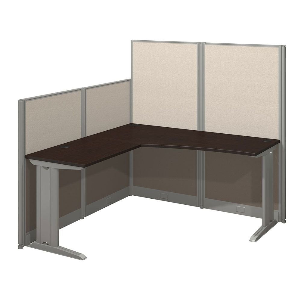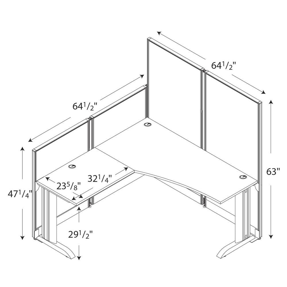 - Each L shaped computer desk has a tall 63-inch panel for privacy and focus as well as a smaller 48-inch panel for easy communication. The fabric-covered privacy panels can be installed on either side for a custom office layout.