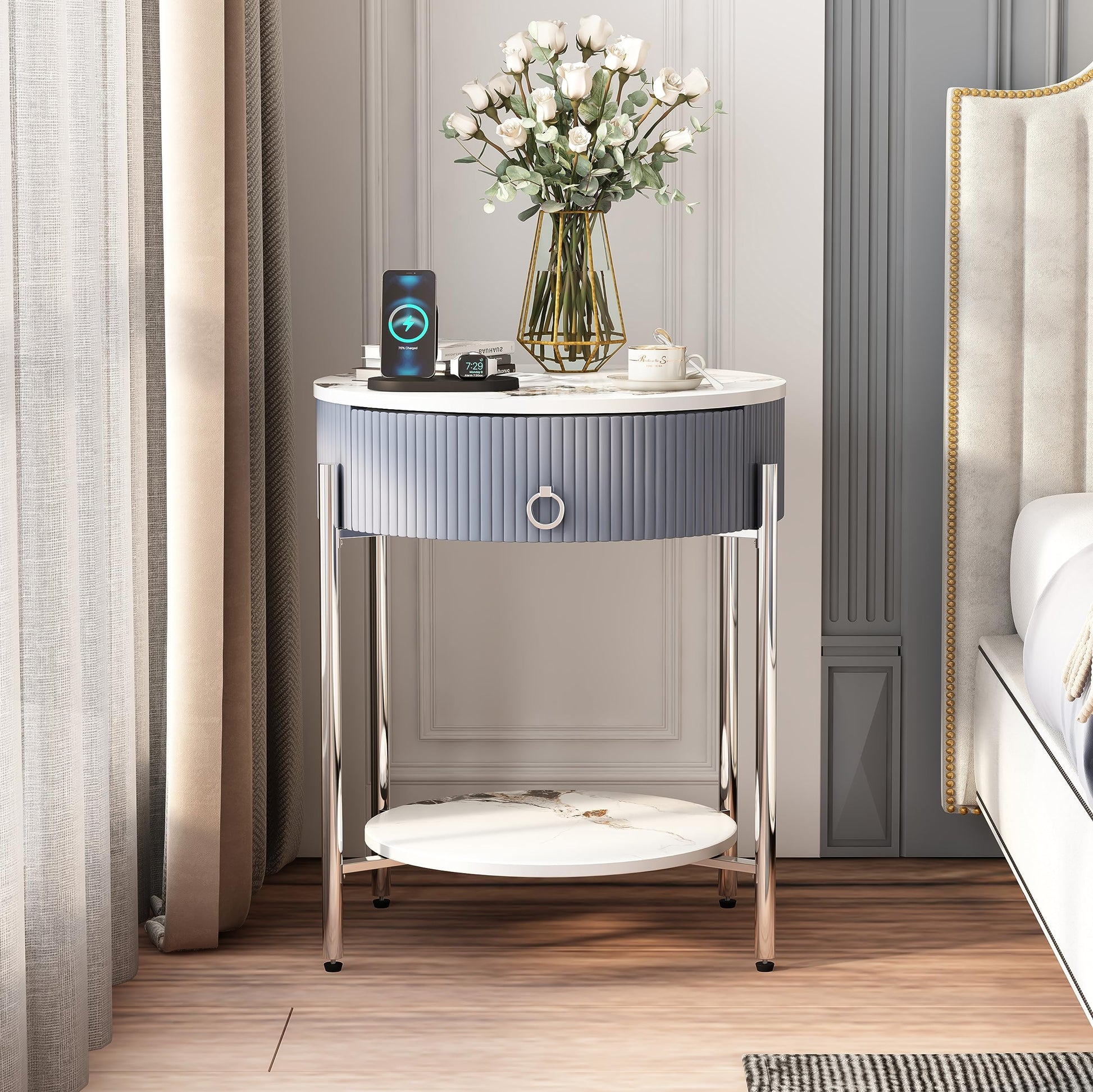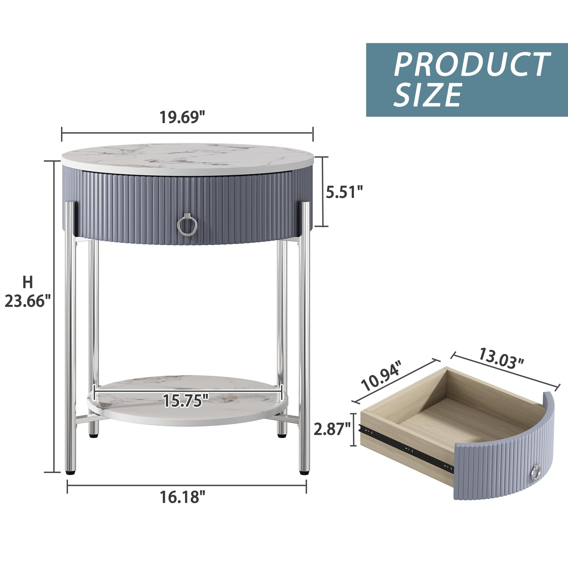 Round Side Table with Drawer, Modern Nightstand with Shelf and Chrome