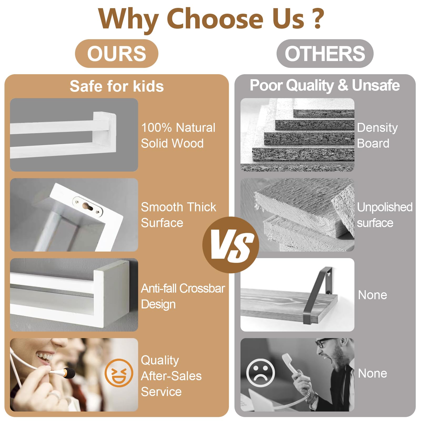 - Safety First, Sturdy ConstructionDesigned with your baby's safety in mind, our shelves are smooth-edged, with no protruding hardware. With a protective wood bar, prevent books from falling off. Built to last, our nursery shelves are crafted from high-quality materials ensuring durability and longevity.