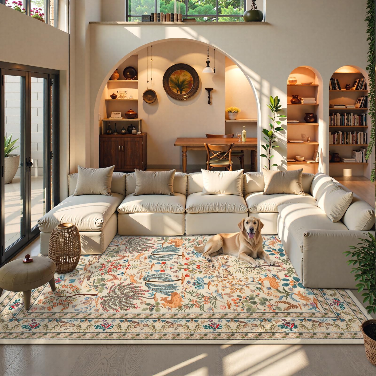 - Soft Botanical Animal Print Rug: Our area rug 8x10 is made from faux wool fibers, which are super soft and comfortable to step on. This living room rug has vibrant forest animal motifs against a neutral backdrop, making your space stand out effortlessly
