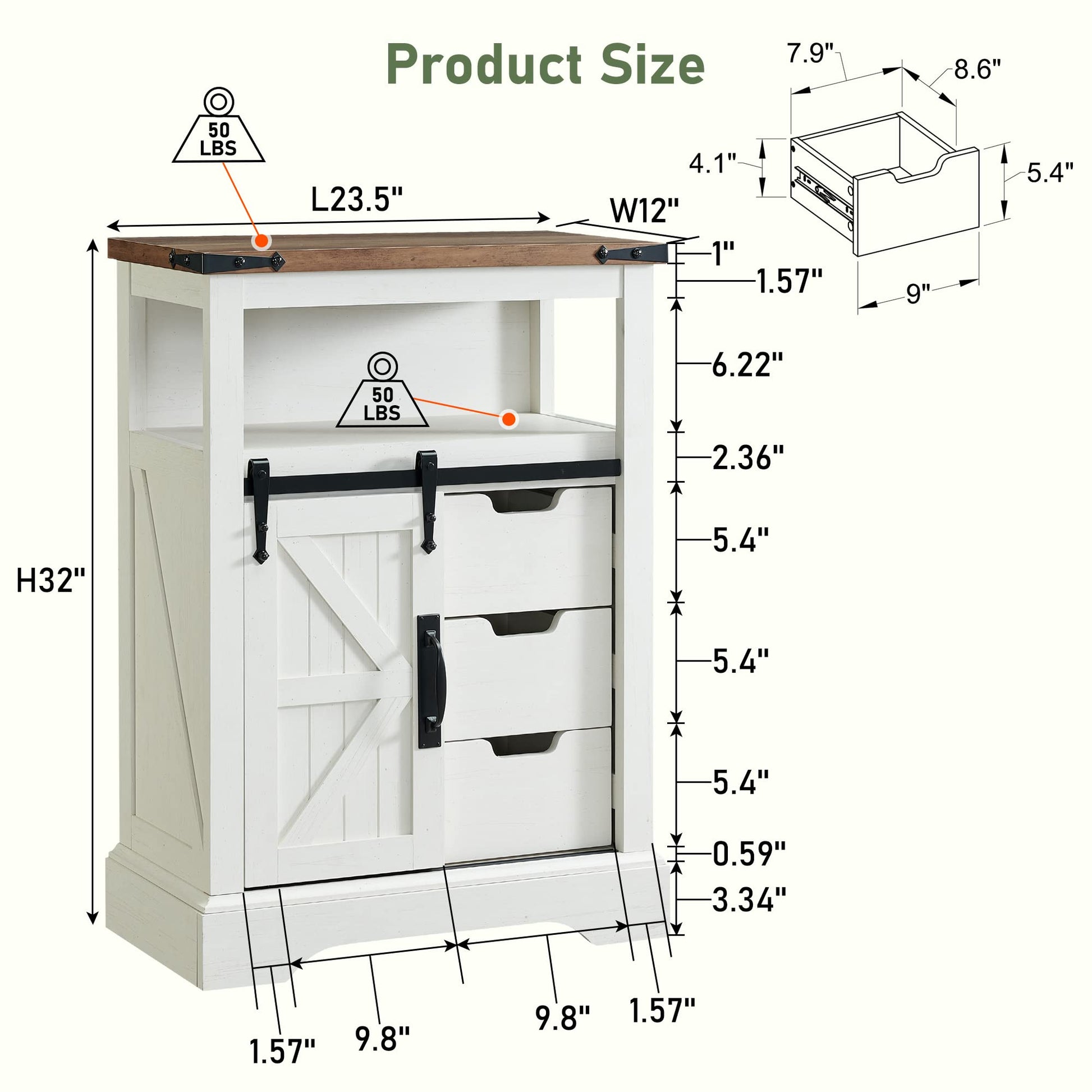 - CUSTOMIZED STORAGE SPACE 23.5"L × 12"W × 32"H, Utilize the tabletop to store cleaning supplies of any height, open shelf and three storage drawers for small items. Also sliding barn door and adjustable shelf to suit your storage needs, creating an orderly life space without mess not only in bathroom