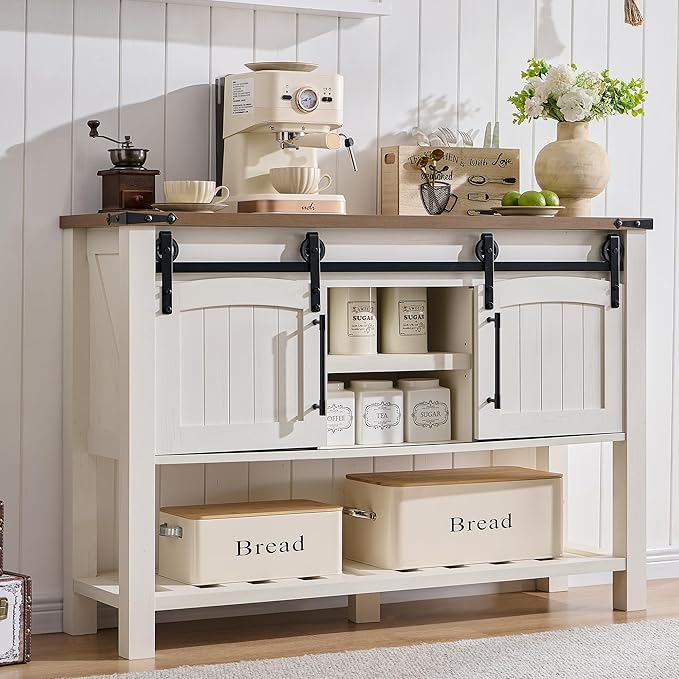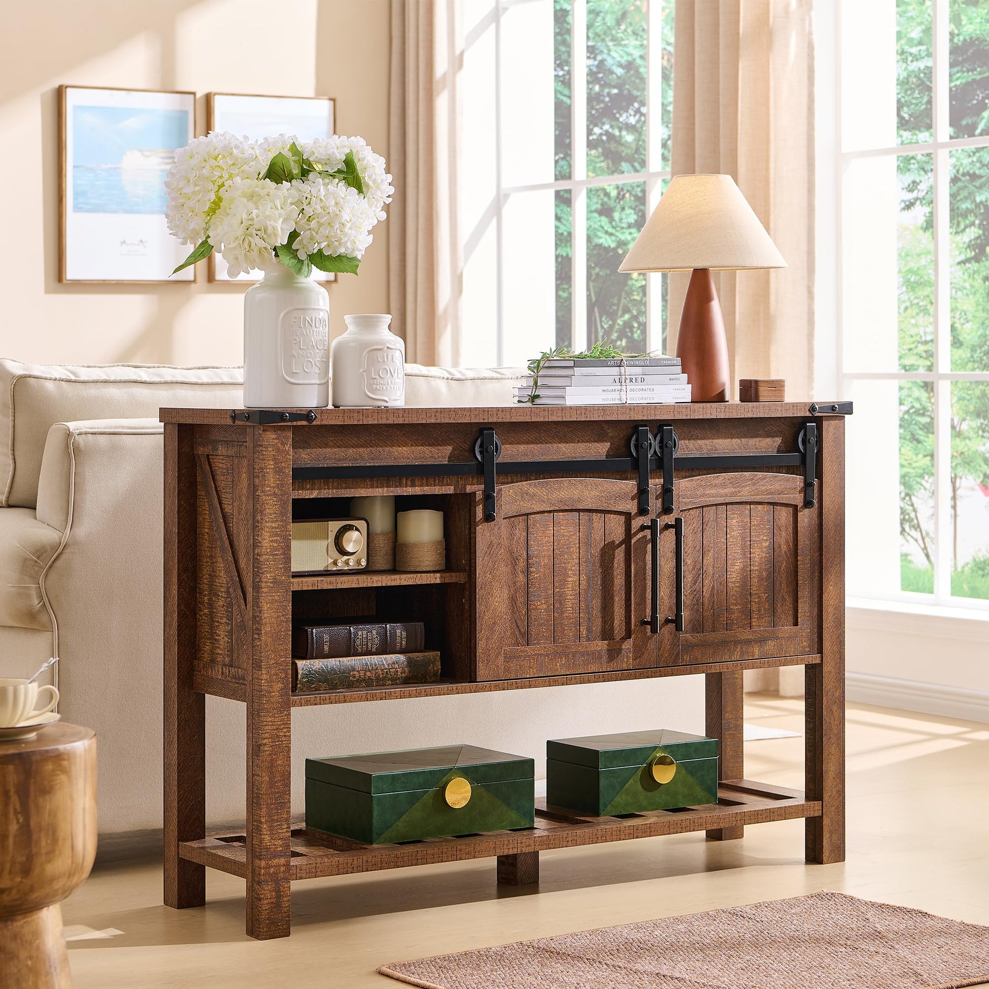 - Farmhouse Entryway Table: Our 46-inch farmhouse-style entryway table with sliding arch doors features a unique farmhouse wood grain finish with metal trim. A great blend of farmhouse style and modernity, adding a beautiful, elegant touch to your living room. A Sideboard console table for the entryway with storage can fit well in any space in your home, such as the entryway, hallway, foyer, kitchen, bedroom, and living room.