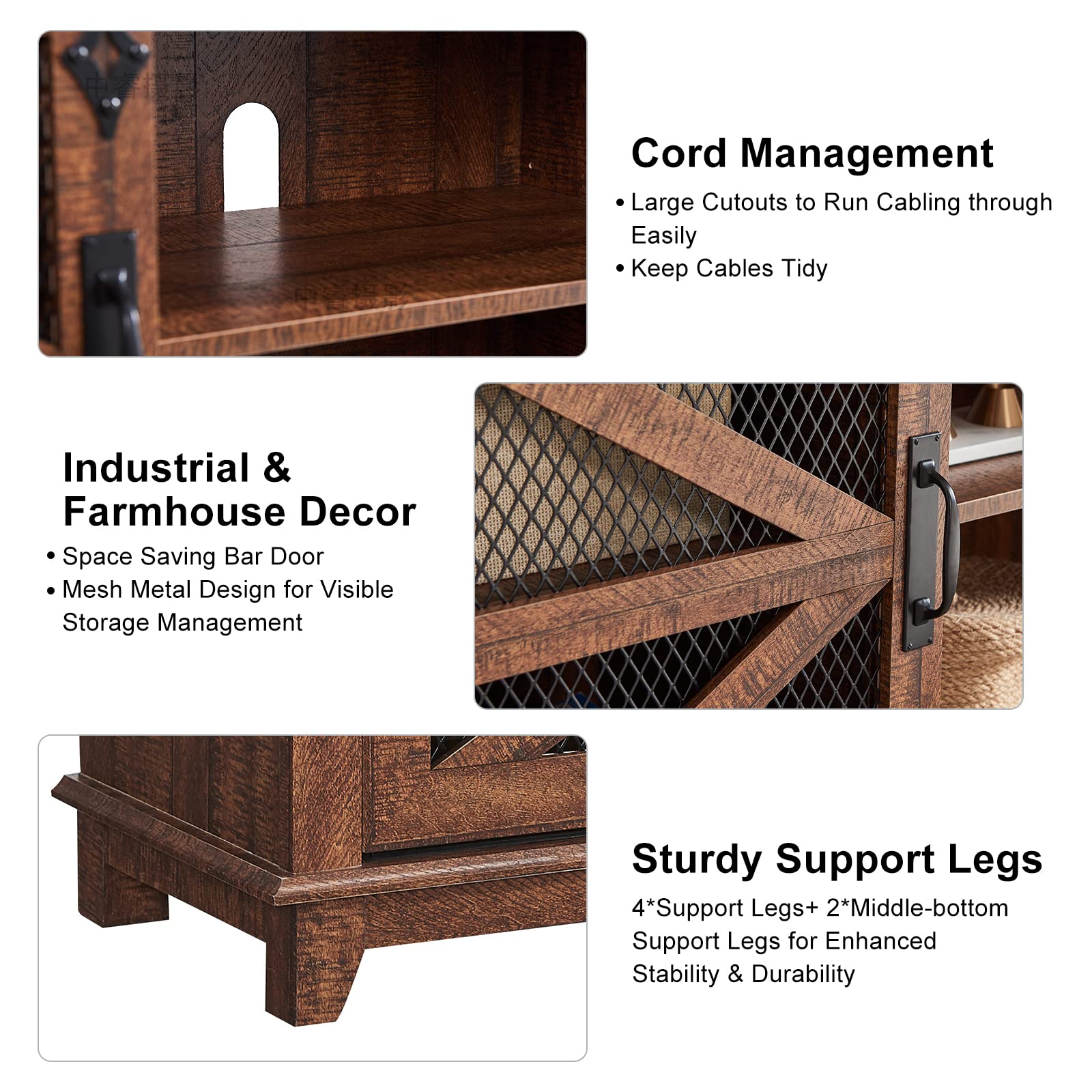 - CHIC INDUSTRIAL& FARMHOUSE STYLE:Product Measured: 58" L × 15.75" W × 32"H , Fits for flat curved screen TVs up to 65''. It features a perfect blend of industrial and modern farmhouse.The reclaimed barnwood finish delivers a naturally aged feel and creates a cozy and retro vibe. Enhancing its charm: sliding barn doors with inset metal mesh and dark iron-tone hardware.This new media console can fit well in any space in your home and matches perfectly with other farmhouse furniture.