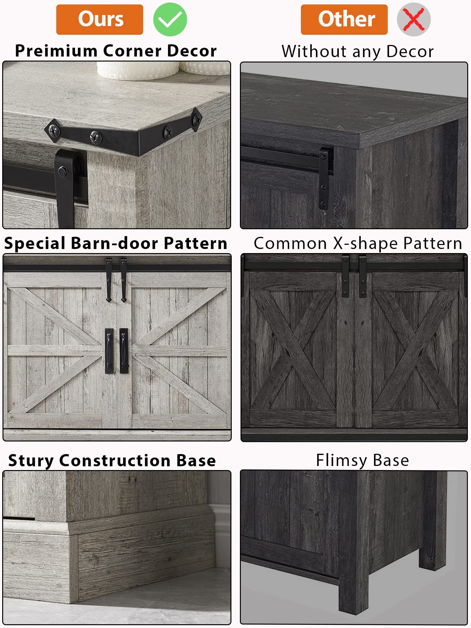 - SLIDING BARN DOORS: Our two sliding barn doors are designed with a special barn door pattern, premium metal handle and fluted detailing, easy access to cabinets and shelves via a metal sliding track, slide smoothly and quietly