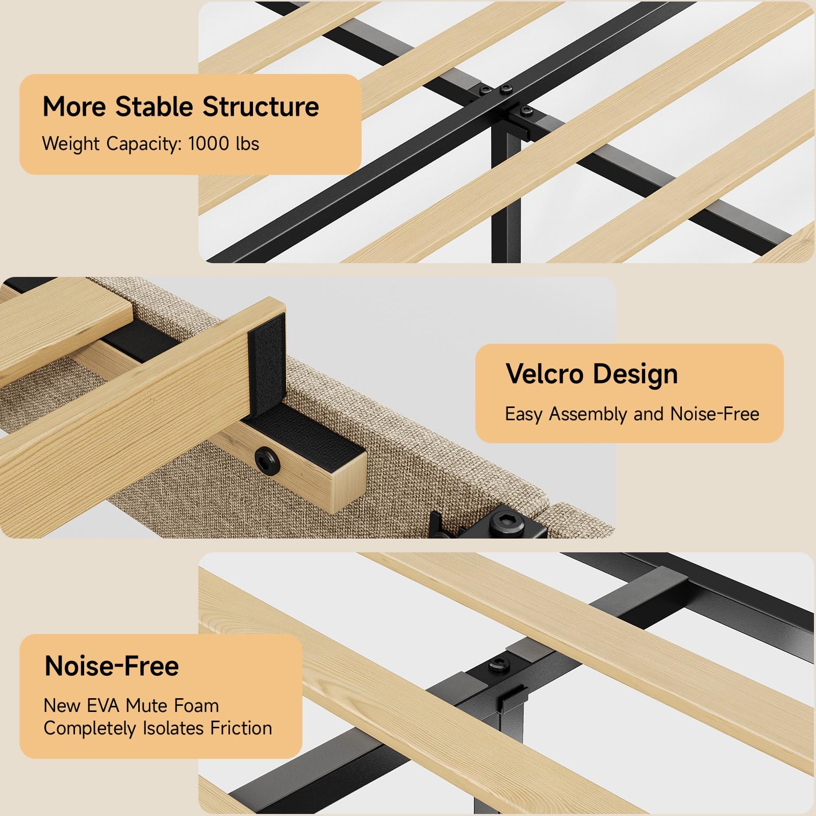 - NOISE-FREE & NO BOX SPRING NEEDED : This bed frame is equipped with a velcro design and EVA mute bars to avoid friction between wooden slats and metal frames, with no squeak, providing you with a quiet sleeping environment. Durable wood and steel slats support extend the life of your mattress without the need for a box spring.