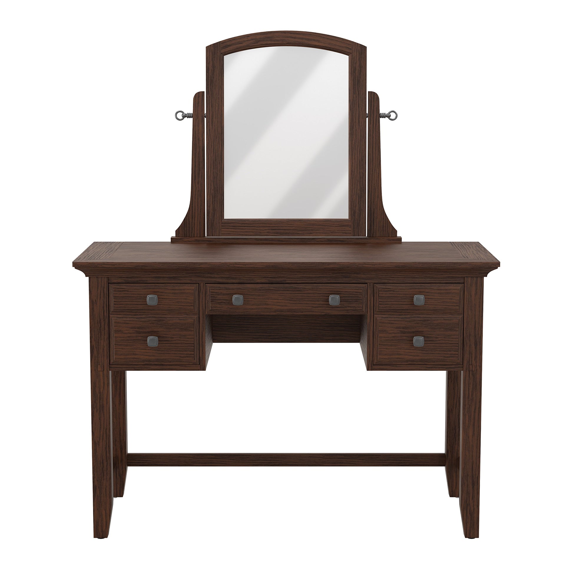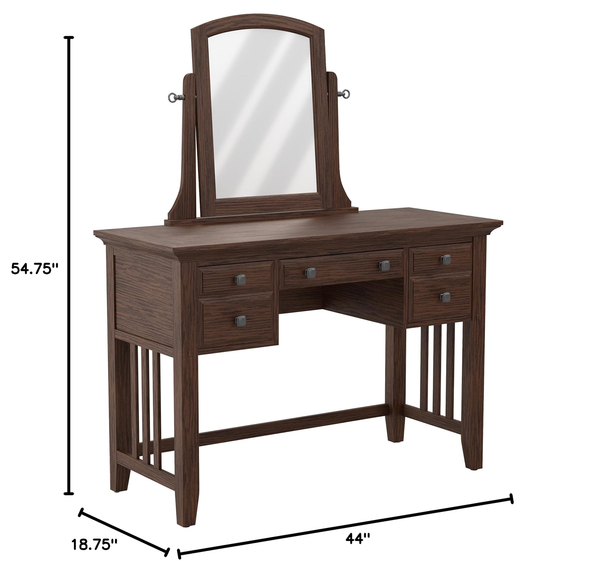 Details: The Modern Mission Collection is an updated version of the traditional Craftsman design. The renewed look has enhanced darker hues in the finish with a deep oak grain look and feel. The five step finishing process is perfectly accented by the beauty of the new gunmetal hardware. The three drawer vanity is beneficial for storing your hair and makeup tools. A generous 44” wide table top provides a large working space and the included beveled mirror swivels 360 degree for adjustability. Help ensure your morning preparations with the Modern Mission vanity and mirror set.