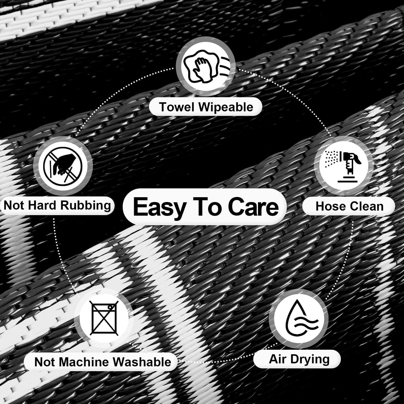 - EASY TO FOLD, STORE AND CLEAN These plastic camping rugs with foldable lines are easy to clean, store and carry but no worries about spills or sand and dirt outside. Simply sweep up these patio rugs with soft brush or towel to remove dirt or hose down for a deeper cleaning, air dry is recommended.
