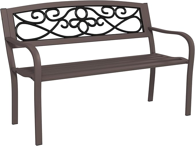 - Sturdy Metal Frame: A durable powder-coated steel finish with a cast iron backrest provides a sturdy yet comfortable frame. Weatherproof and rustproof material allows it to be left outdoors for extended periods of time.