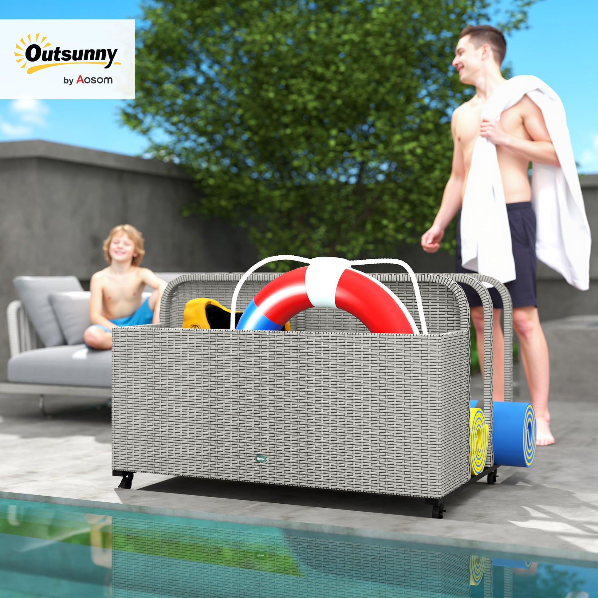 - Outdoor Pool Towel Storage Bin Info: Overall dimensions: 43.25" L x 36.8" W x 29.5" H. Long storage basket size: 39.25" L x 11.75" W x 19.75" H.