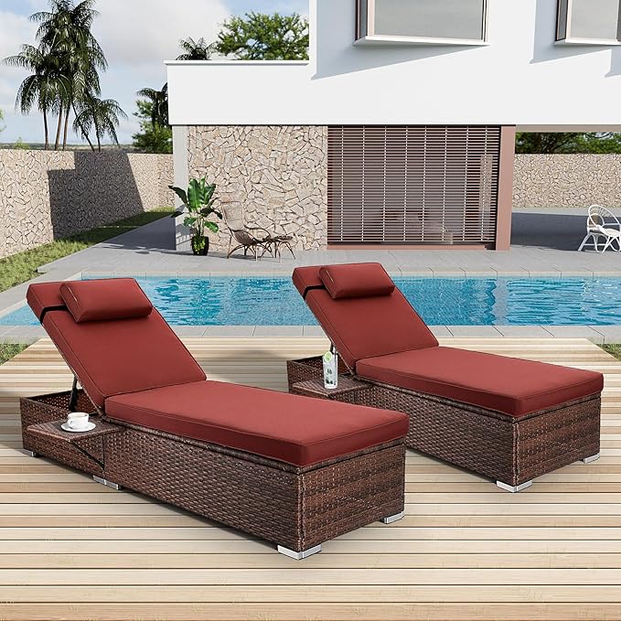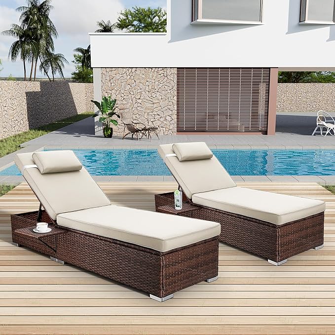 - All-weather Rattan: Made of high-quality PE rattan wicker, these outdoor chaise lounges are carefully hand-woven by craftsmen, neat and tight. The rattan is 25% thicker on both sides, and the smooth surface is treated with premium coating, waterproof and easy to maintain, not easy to fade or crack, which is stronger and more durable than other general wicker!