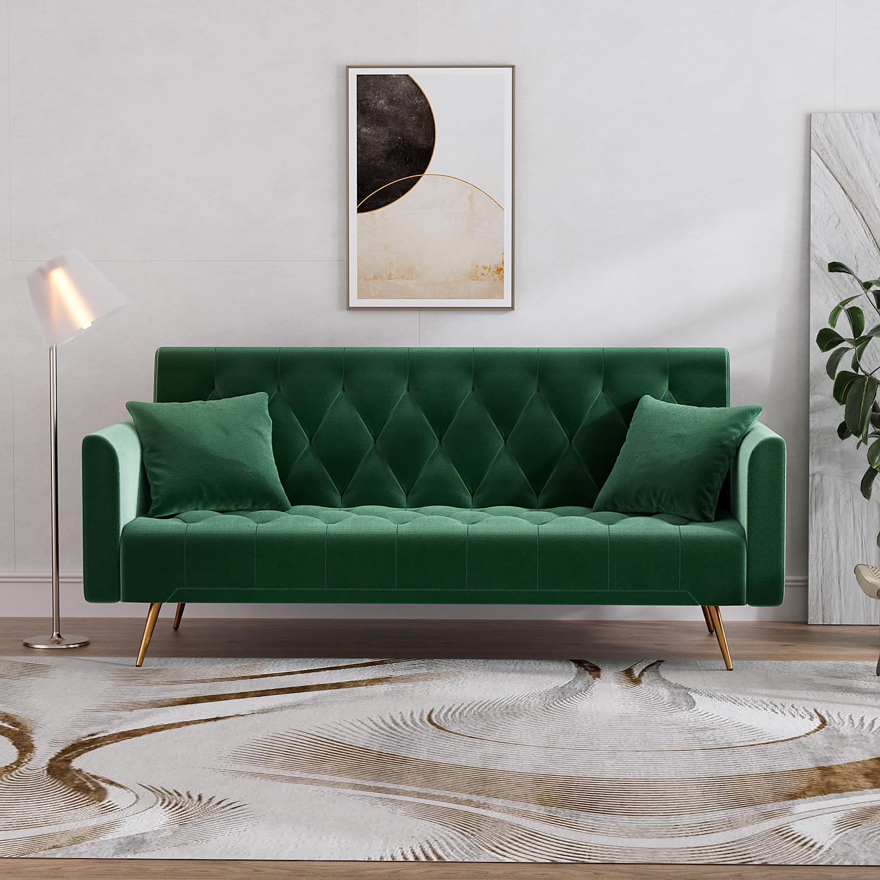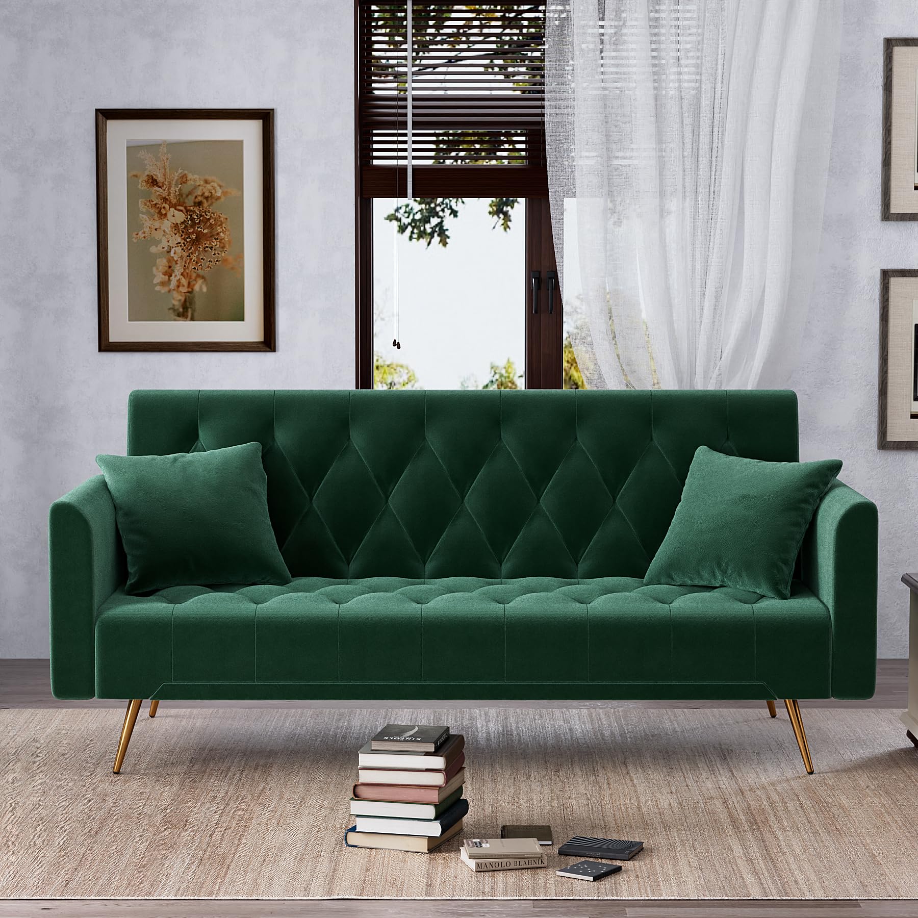Velvet Futon Sofa Bed with 2 Pillows, Convertible Futon Couch, Sturdy Sleeper Sofa in 71 inch