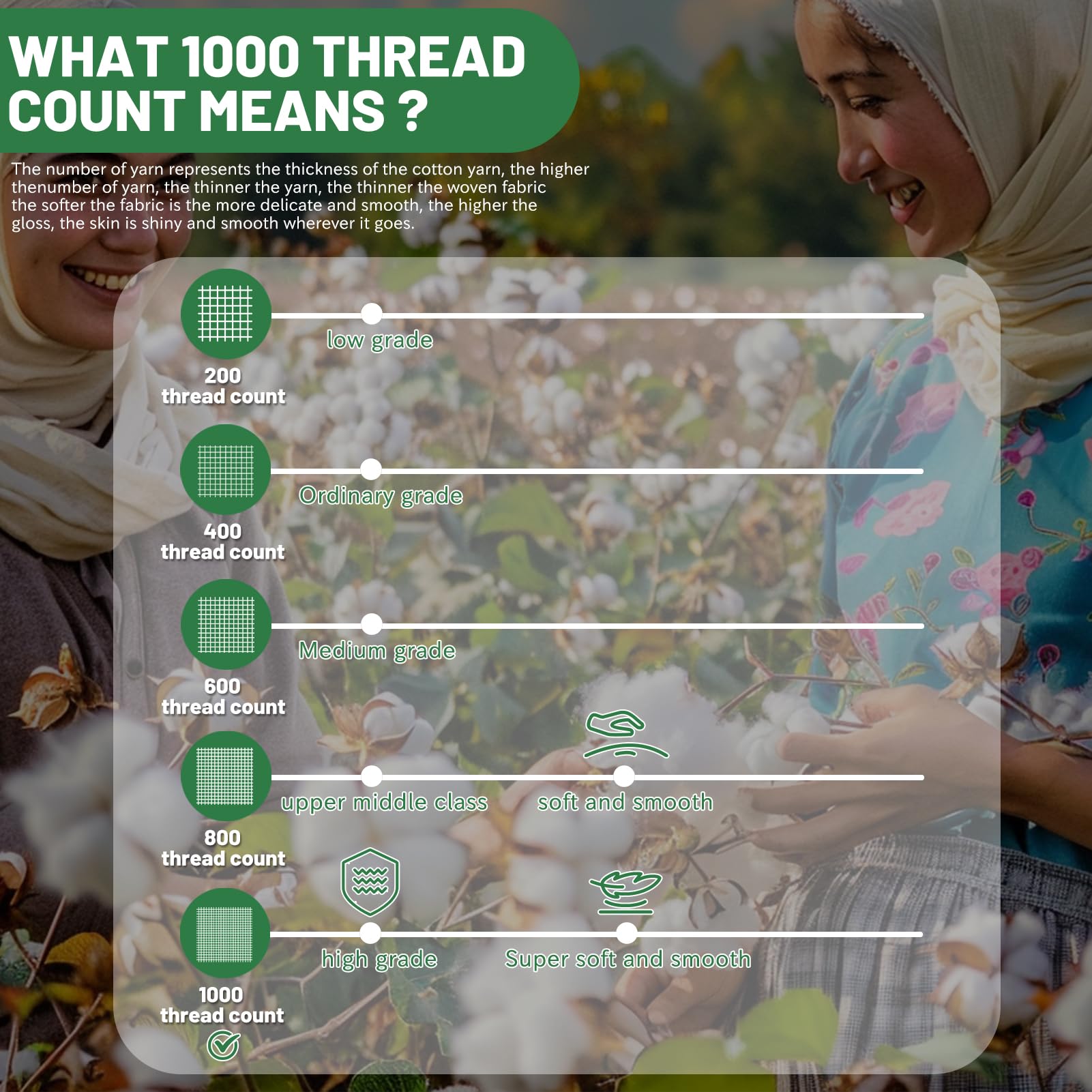 - Cotton Sheet Set Queen Size:These luxurious 1000 thread count queen sheet sets Each 4 piece Queen size sheet set which includes 1 flat sheet (90" W x 102" L) 1 fitted sheet (60" W x 80" L + 16" deep pocket) and 2 Queen pillowcases (20" W x 30" L).The perfectly fitted sheet features all round elastic Deep pocket fit that ensures it doesn't loosen or bundle And the seams also give them a stylish and elegant look