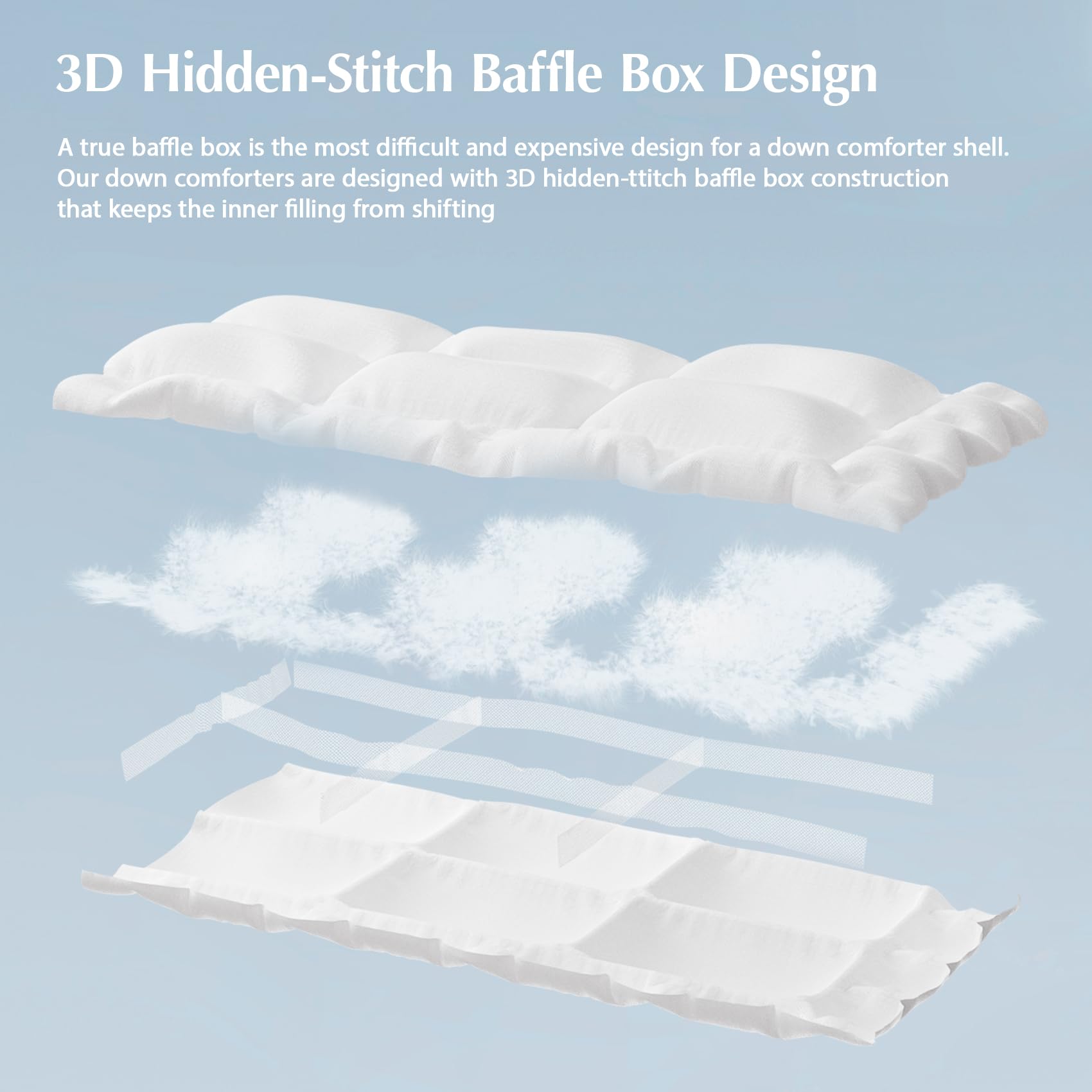 - 3D BAFFLE BOX DESIGN - No Shift, No lumpy—Ever, balanced Down Fill-Weight in Each Chamber, A true baffle box is the most difficult and expensive design for a down comforter shell. Our down comforters are designed with 3D baffle box construction that keeps the inner filling from shifting. This means that you can enjoy exceptional fluffiness and brings you ultimate sleeping experience.