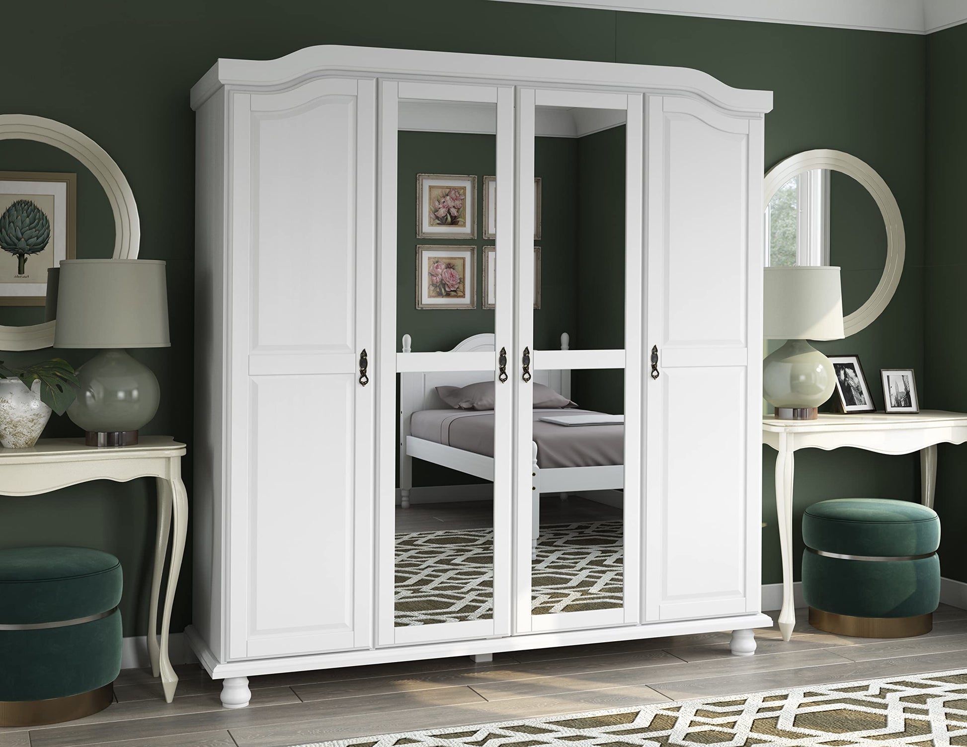 100% Solid Wood Kyle 4-Door Wardrobe/Armoire/Closet with Mirrors, White
