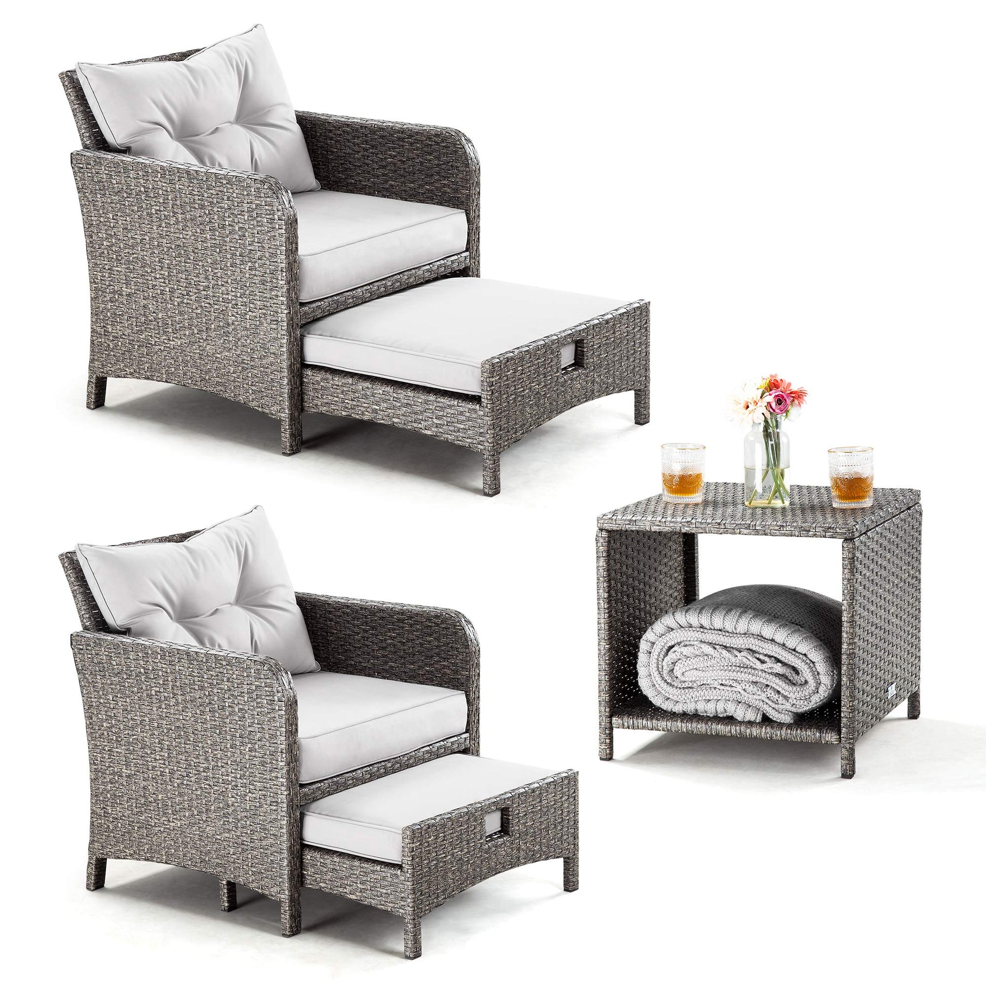 - Space Saving Design The ottoman of our wicker patio conversation chairs set is cleverly designed to be tucked under the chair, maximizing space efficiency. By storing it under the chairs when not in use, you can greatly reduce the amount of space it takes up. If you're in need of a patio rattan furniture set that will save you valuable space, look no further than this 5-piece wicker furniture set.