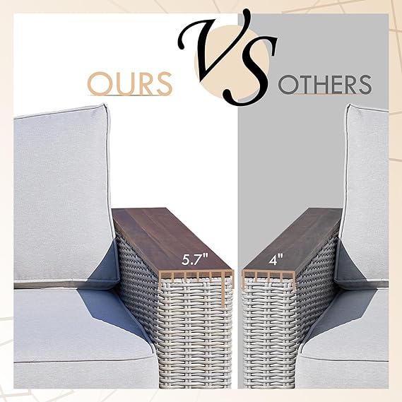 - Modern & Cozy: Unique light grey semi-circular rattan, wood grain handrail with beige cushion interplay, large seat with wide armrests, patio set changes your outdoor living style.