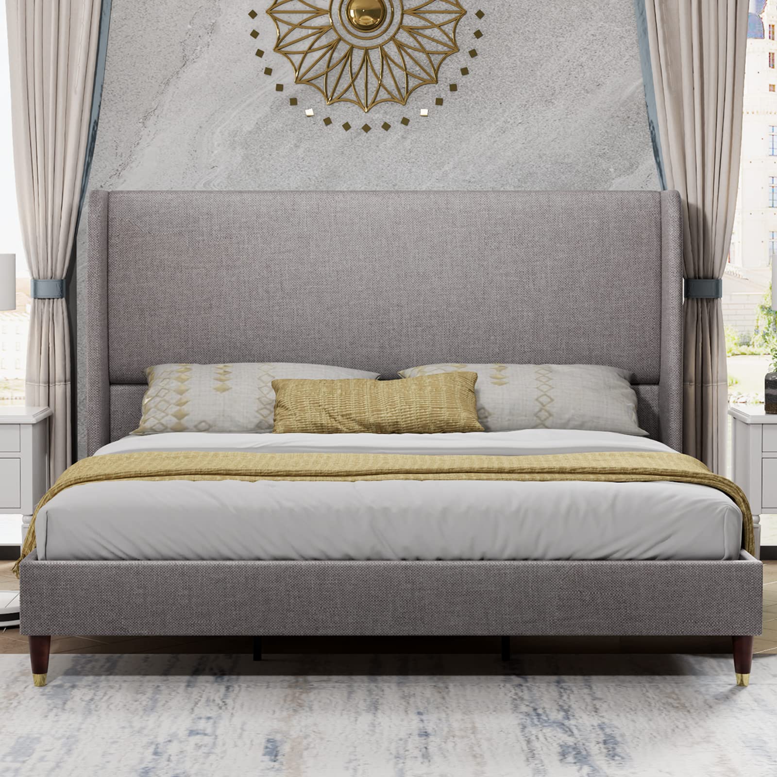 Queen Platform Bed Frame 51.2" High Headboard Linen Tall Upholstered Bed/No Box