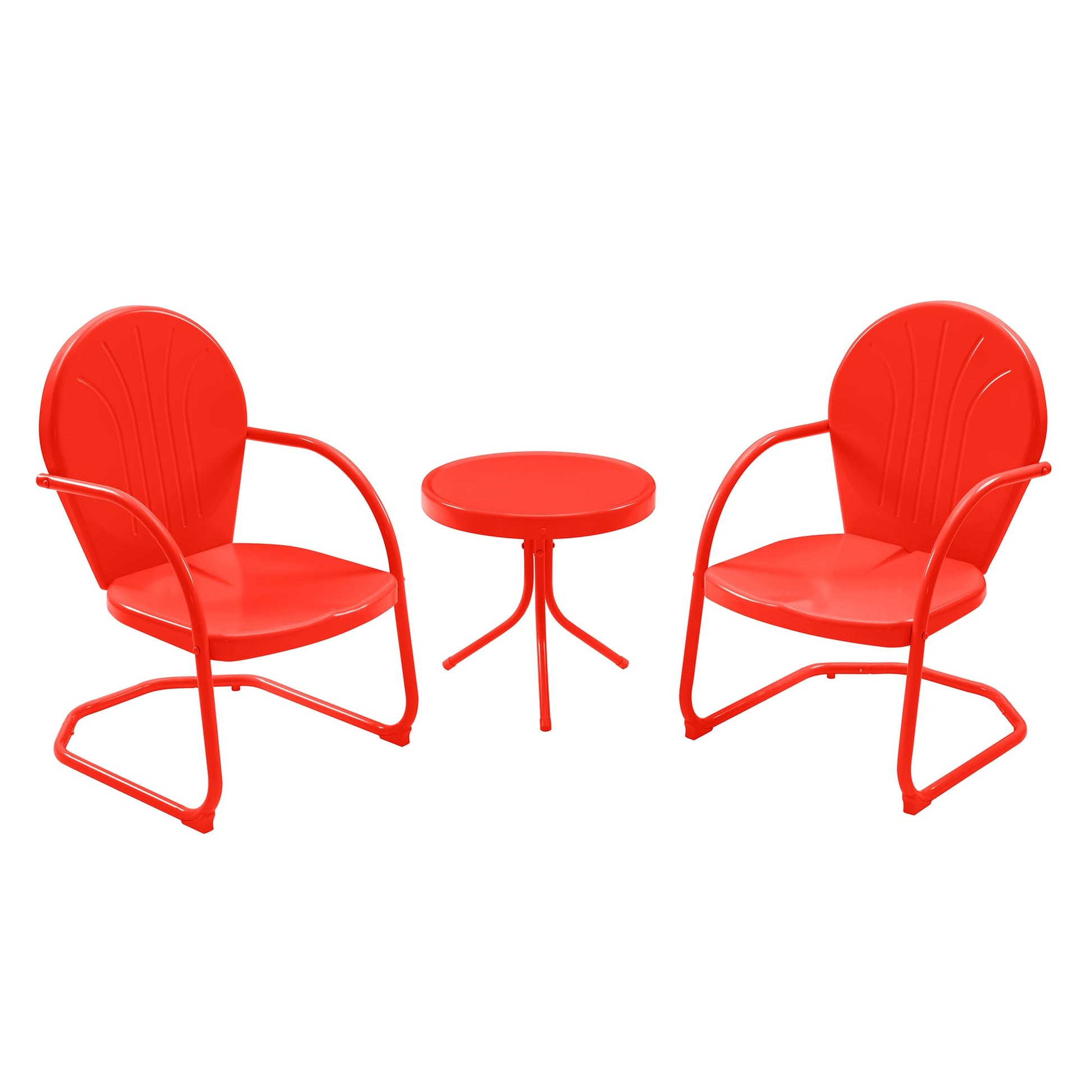 - The patio bistro set is made up of two c-spring motion chairs, a side table, and a color scheme that is inspired by vintage red from childhood.