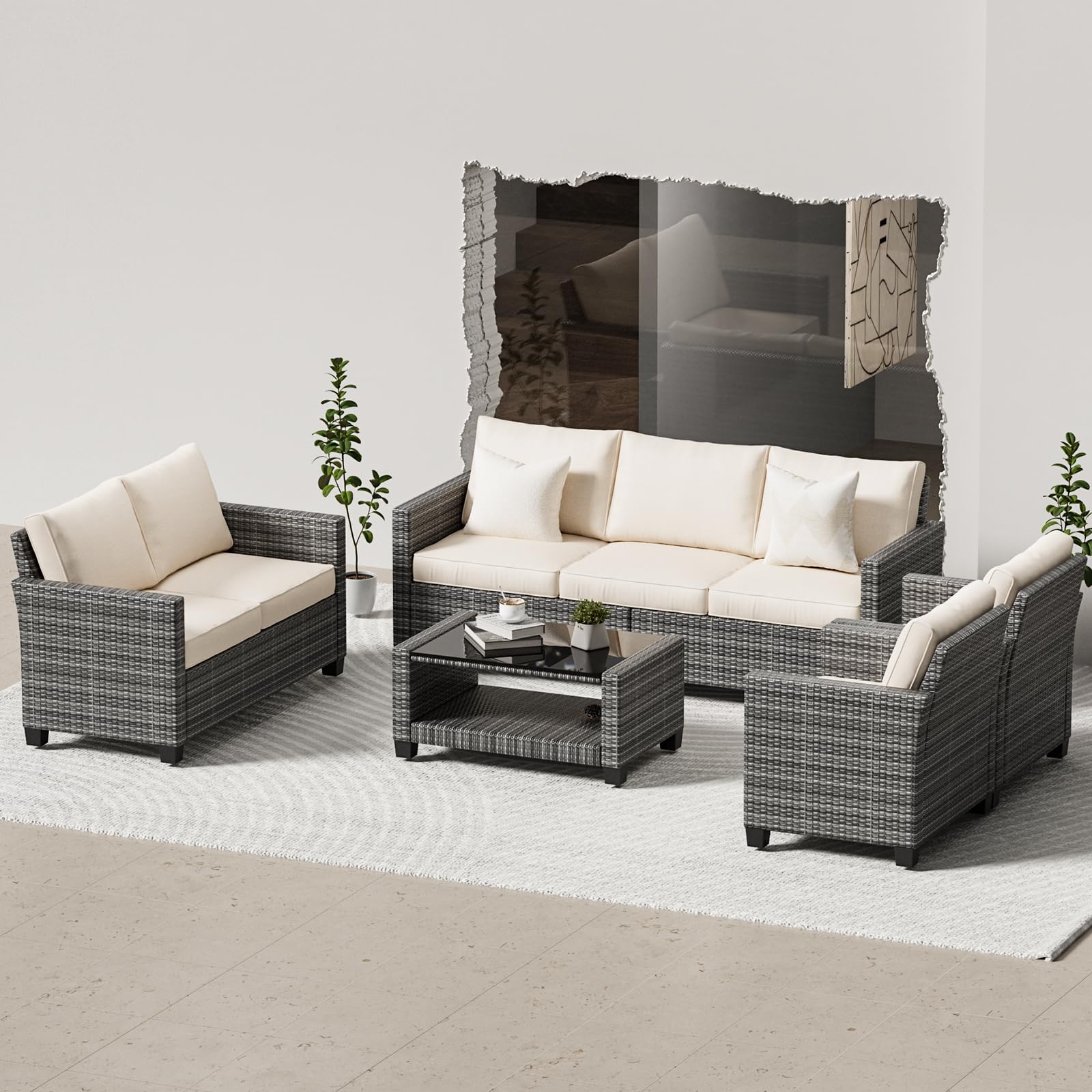 Patio Furniture Set 5 Pieces, Outdoor Seating Furniture with 7 Seat and Glass Coffee Table