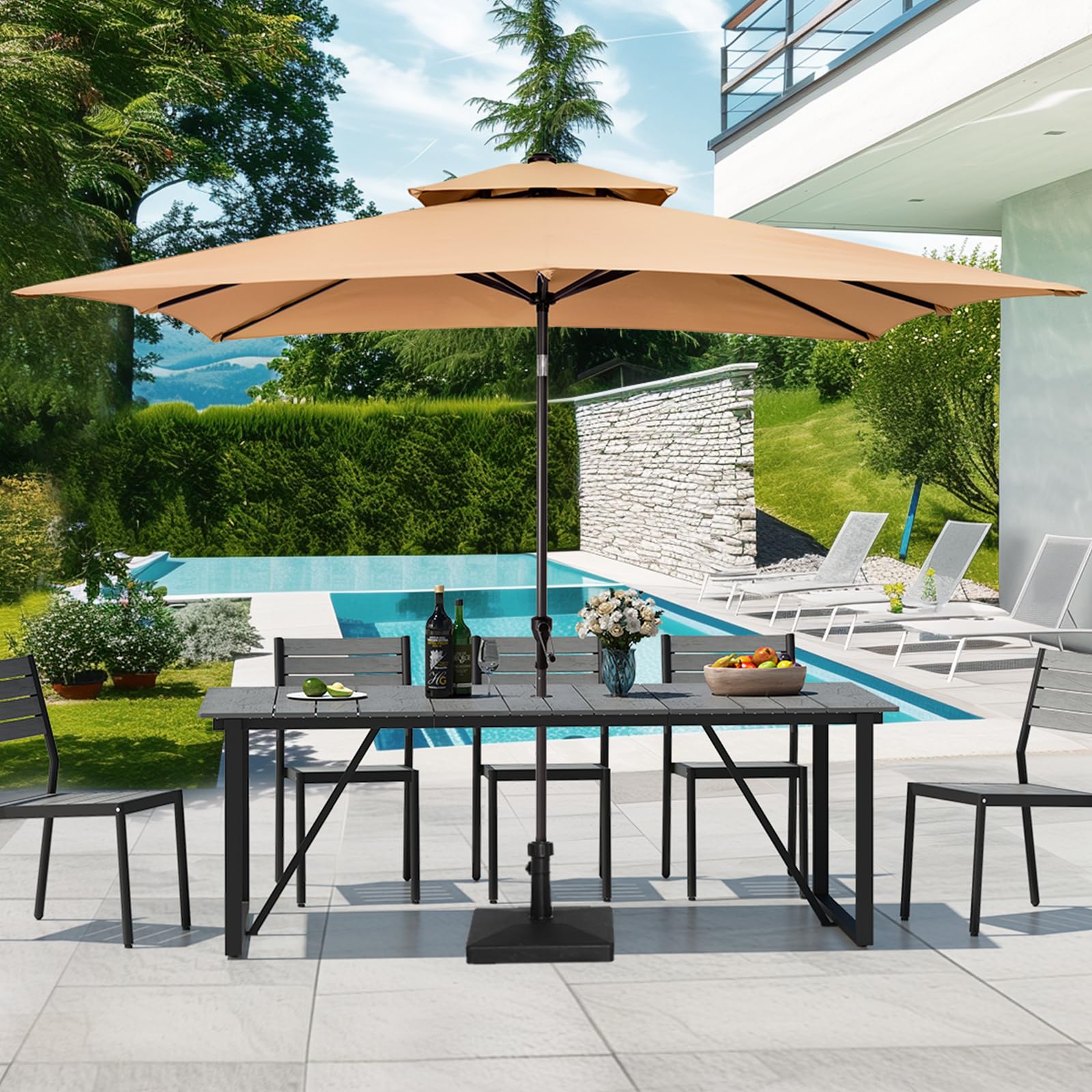 - All-Weather Material: The lightweight yet high-strength aluminum frame ensures stability, while the tabletop are crafted with anti-scratch and weather-resistant wood-like material, ensuring durability in various weather conditions - a patio table that defies the seasons