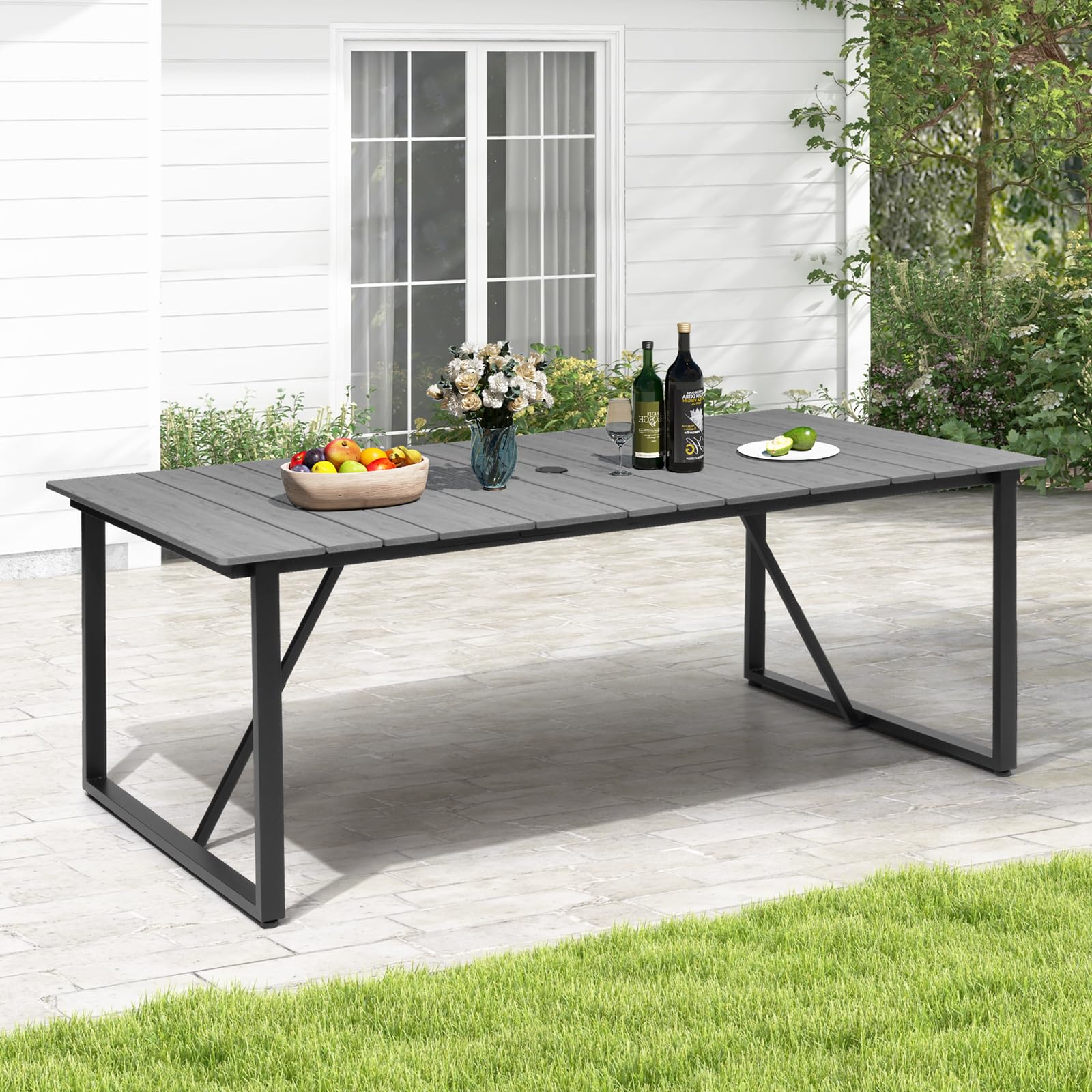 Patio Table with Umbrella Hole 83" Rectangle Indoor Outdoor Dining Table for 6-8 All Weather