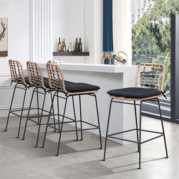 - [Sturdy & Durable]: Featuring a powder-coated steel frame, UV and all-weather-resistant PE resin rattan wicker, durable yet lightweight which makes it easy to carry and move. Designed to last, this beige wicker outdoor bar stool set of 2 will provide you and your guests with the ultimate drinking and relaxation area to complete your backyard oasis.