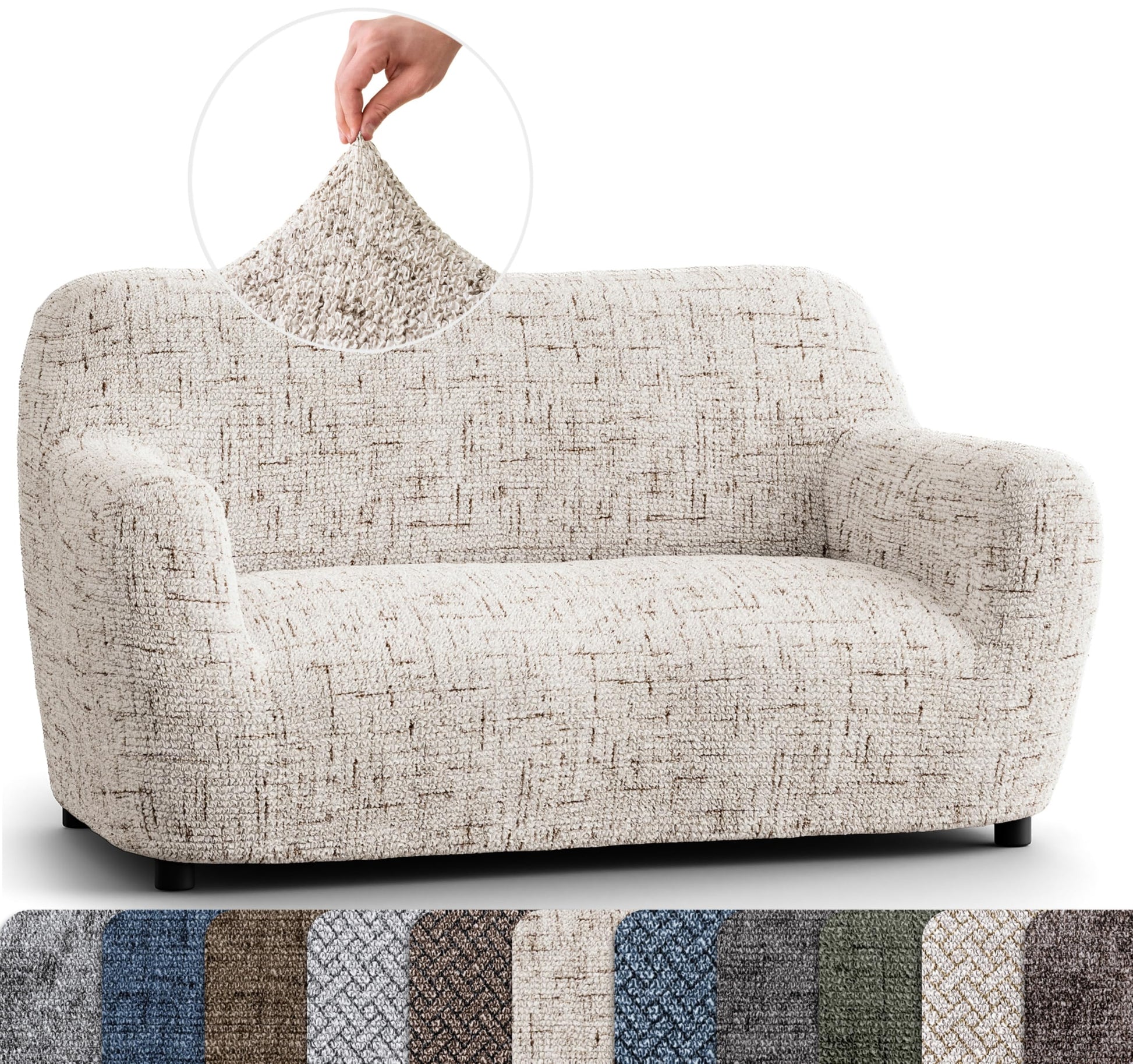 - Our slipcover stretches to fit chairs and a half, loveseats, and couches 40”-63” wide. Made with patented bi-elastic fabric, it is adaptable and durable, perfect for everything from oversized armchairs to loveseats. PLEASE MEASURE BEFORE PURCHASING.