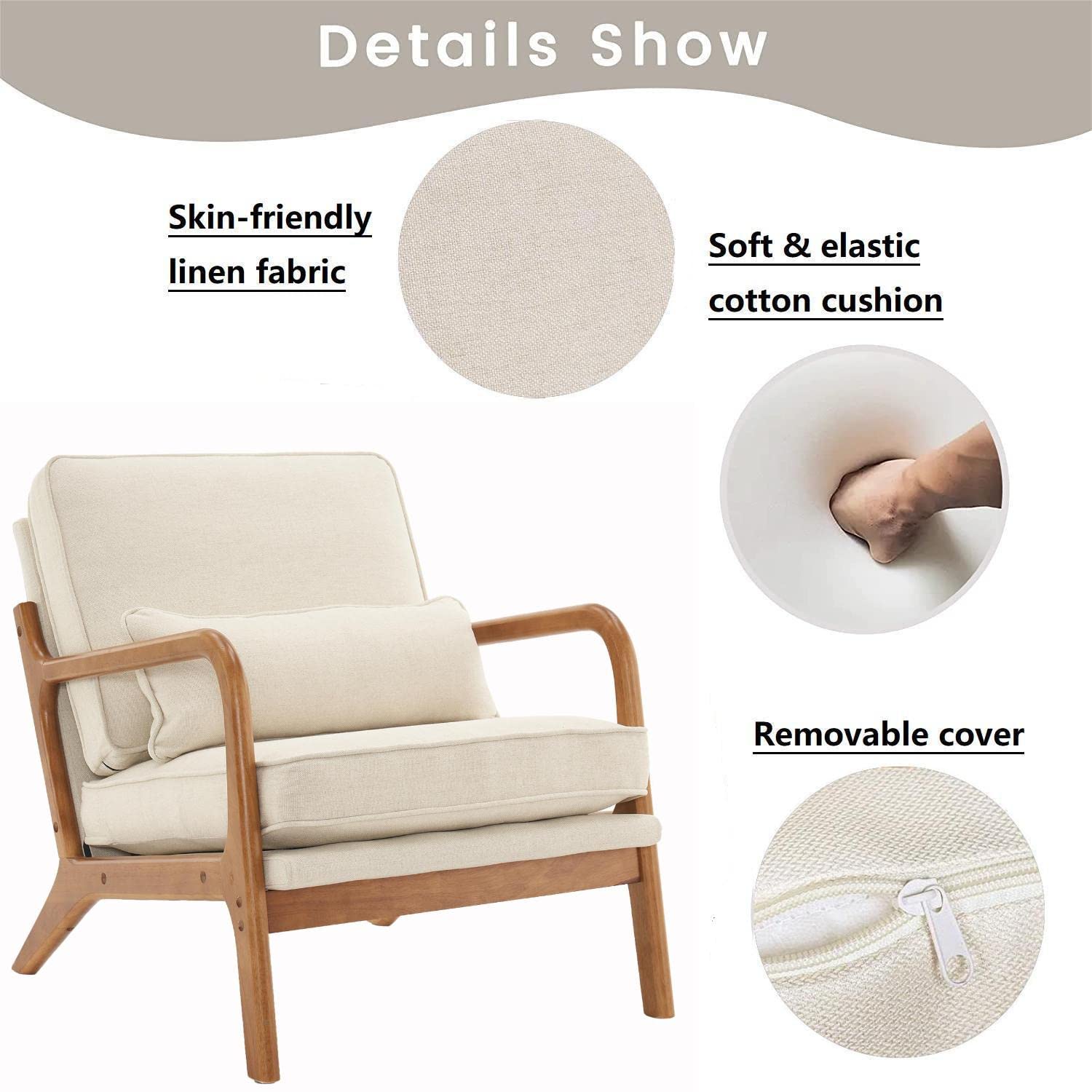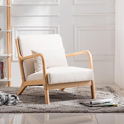 - MID-CENTURY MODERN ACCENT CHAIR - Designed with curved arms and solid rubber wood legs, this accent chair with an extra pillow is full of mid-century style charming. The beige color fabric with natural wood color of frame is a nice combination, which is suitable for any style of your home decorations.