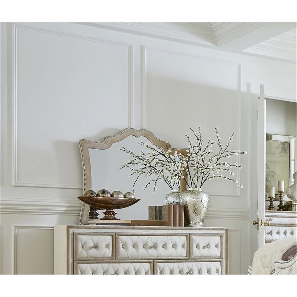 - Materials: Asian hardwood, particle board, foam, fiber, velvet, acrylic buttons, metal leg caps and mirror