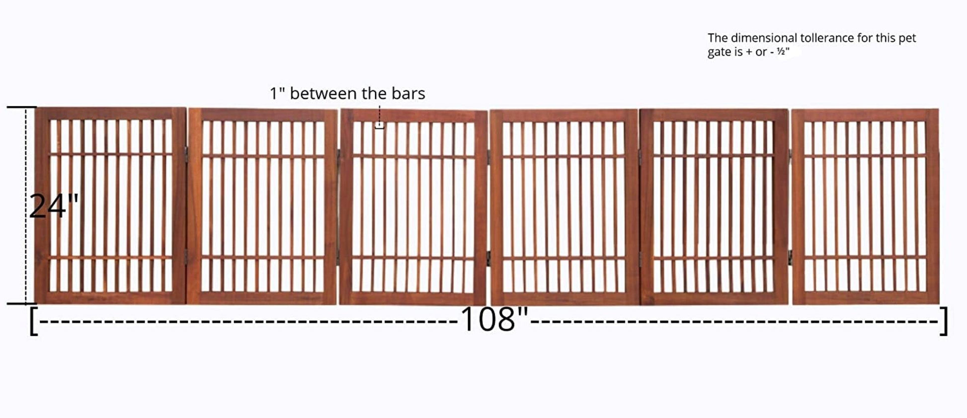 - This is a solid wood pet gate. This portable dog fence has 6 panels. The nominal overall size is 108” W .8” D 24” H. The distance between the vertical bars is 1" This dog gate can be used on the porch outdoors.