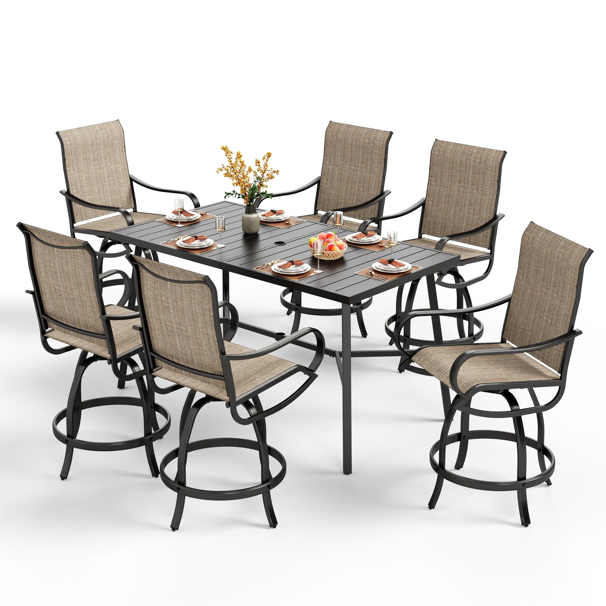 PHI VILLA 7 Piece Outdoor Bar Set, Counter Height Patio Bar Furniture Rectangle Dining Table and 6 Swivel Bar Stools Chairs with Brown Textilene Fabric for Garden,Yard and Deck