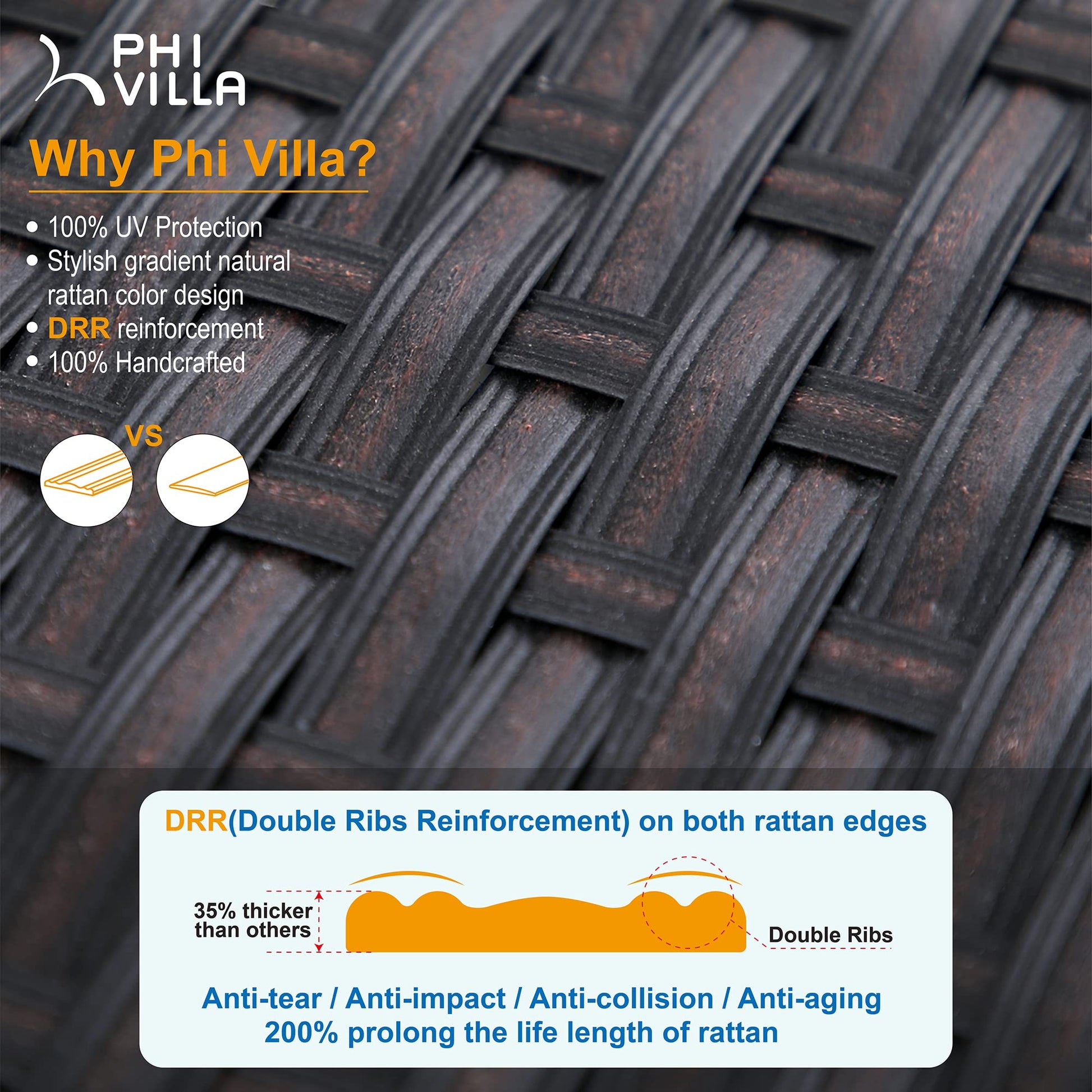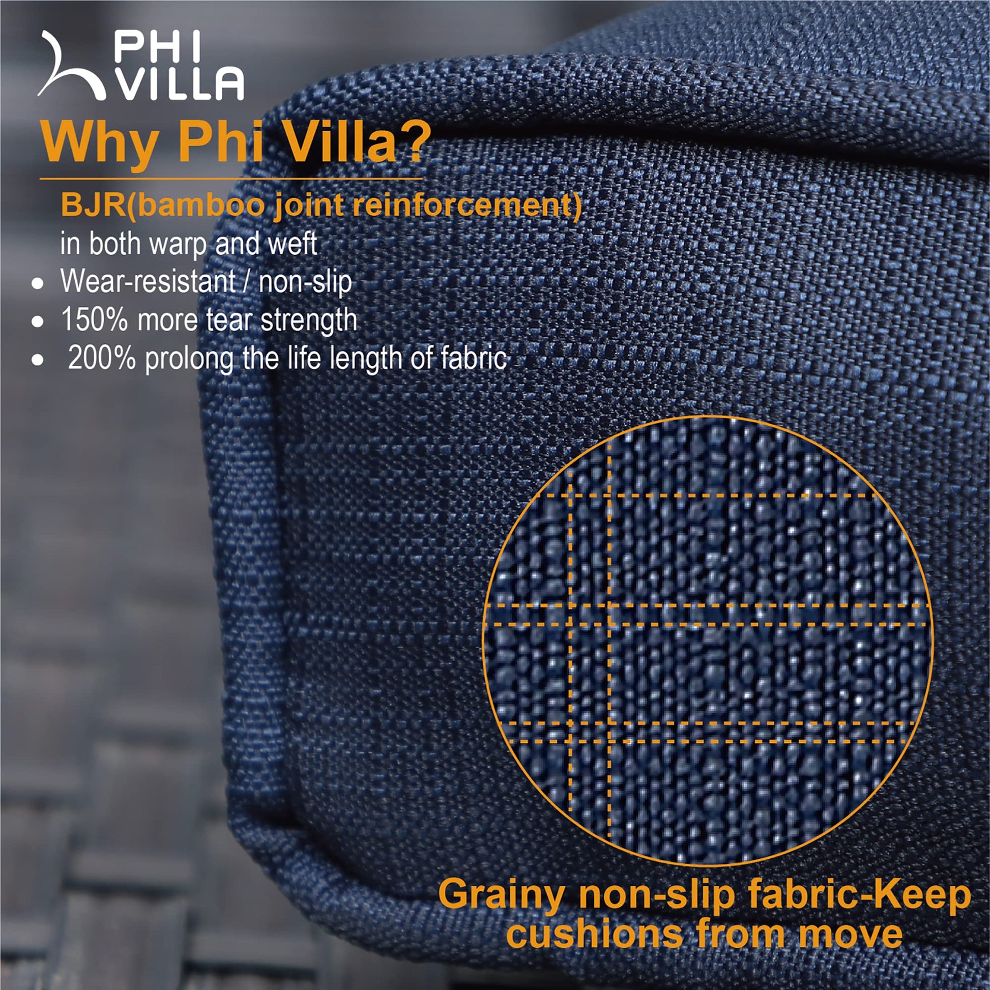 - Dimension: Corner sofa: 29.5"L x 29.5"W x 25"H, armless sofa: 25.5"L x 29.5"W x 25"H, fire pit size: 56" L x 21" W x 25" H, coffee table: 25.5"L x 25.5"W x 12.5"H. Contact us anytime for assistance with your PHI VILLA patio furniture set. Arrange the pieces to fit your outdoor space and create an inviting oasis for lounging, entertaining, or simply enjoying the fresh air. Perfect for garden, poolside, and backyard use.