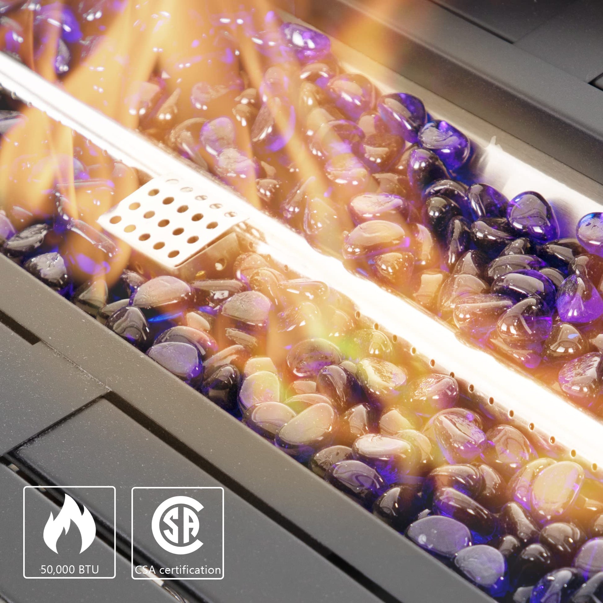 - Efficient Fire Pit Table: Enjoy the warmth and ambiance of the 56" smokeless fire pit table with elegant wicker design and removable lid. Conforming to the CSA certification requirements, this product has been issued a CSA certificate 50,000 BTU. Comes with 15 lbs of blue fire glass to add a touch of style to your outdoor space.