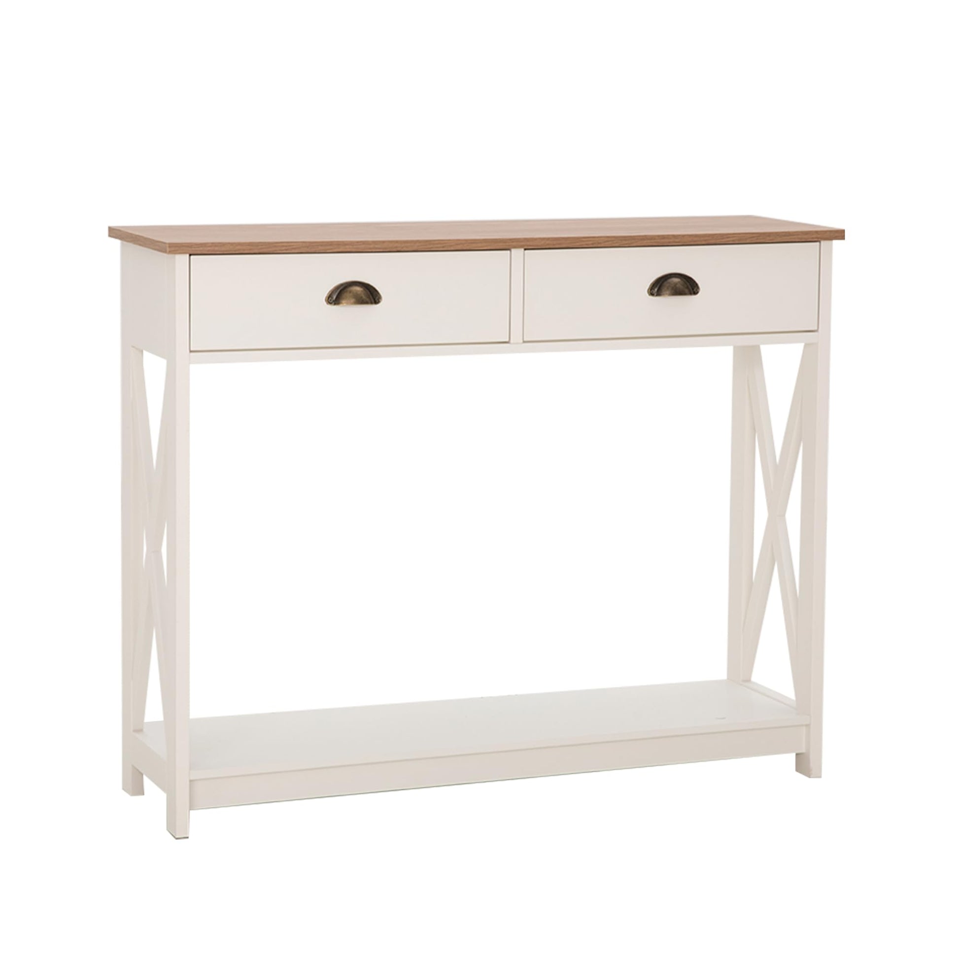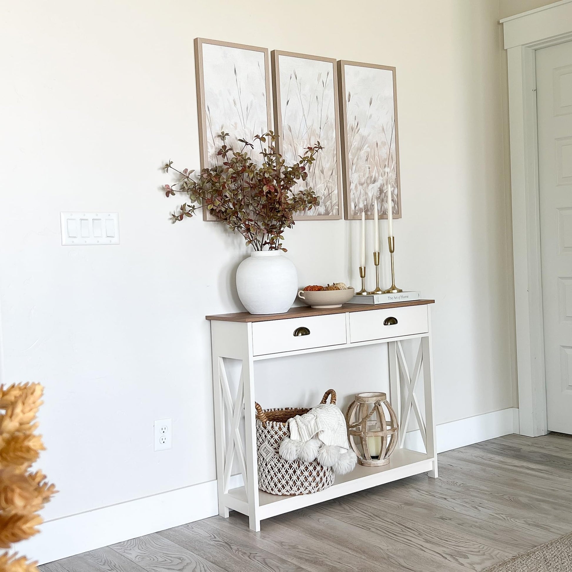 - Narrow Console Table – The perfect addition to your entryway, living room, or hallway! This stunning ivory console table offers a blend of rustic charm and modern functionality, making it an ideal piece for any farmhouse-style home. Designed with two spacious drawers, you can easily store your keys, mail, or other essentials while keeping your space organized.