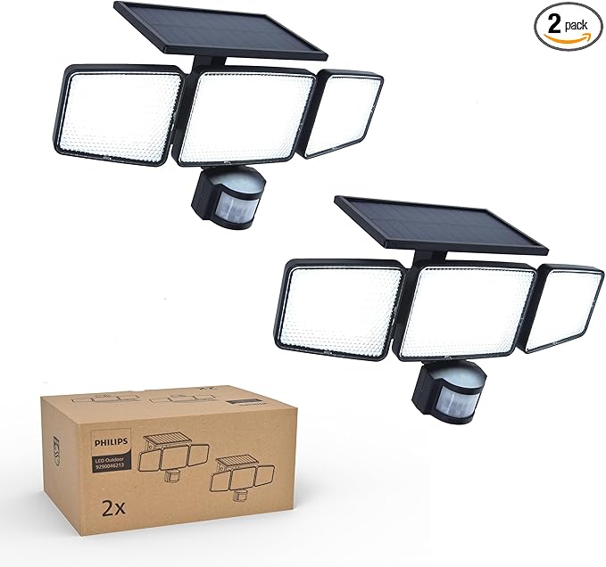 - MULTIPLE USES AROUND THE HOME – With PIR sensor, high light output, and lighting modes, the Philips solar security light is suitable for use in the garden, yard, garage, pathways, front door, or any other outdoor location.