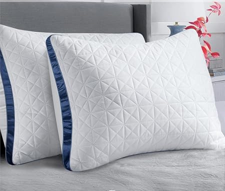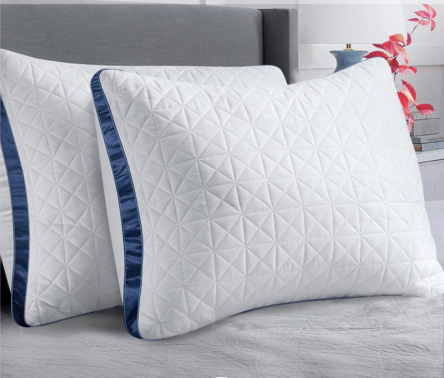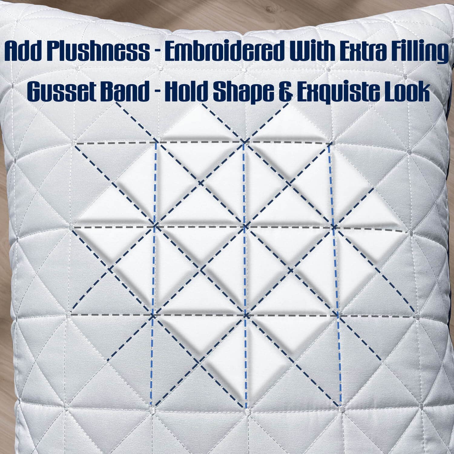 - EXQUISTE DETAILS PILLOWS - Our Pillows are added quilted embossing on front side, it embossed with extra filling to make it more plush, other side is normal side, you will have two choice for your prefer side. Double piping craft with sapphire blue gusseted band design not only give a better look, but also helps hold it's plush shape, won’t flatten out after longtime use. Each details are aim to maximizing its‘ comfort and improving your sleeping experience.