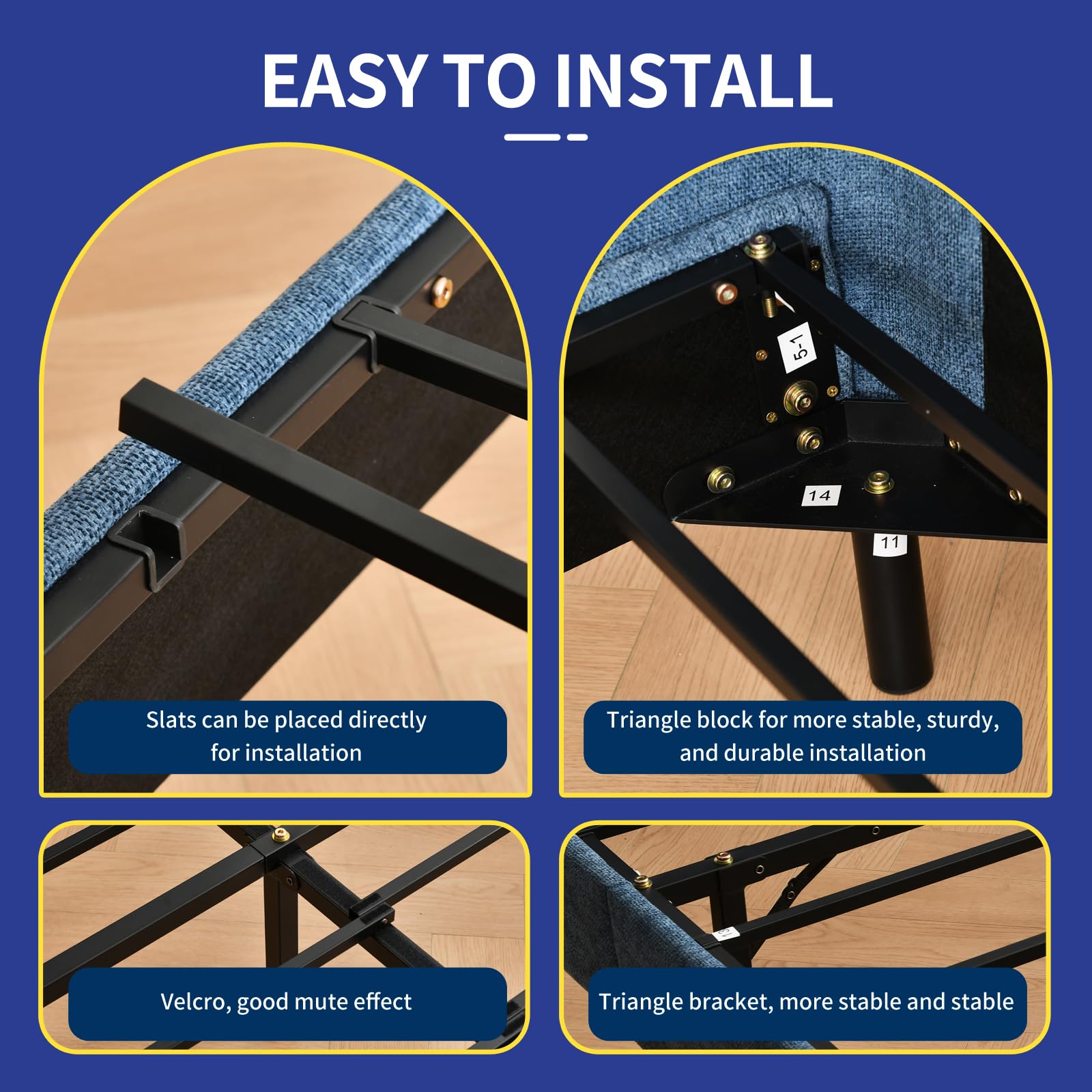 - STRONG AND RELIABLE CONSTRUCTION: Featuring a sturdy center metal support leg and supported by 12 wood slats, your bed frame is built to last and will support most mattresses. Solid wood slats with Velcro fasteners allow for quick setup and eliminate noise. Delivers a restful night's sleep. Fits 8-12 inch mattresses.