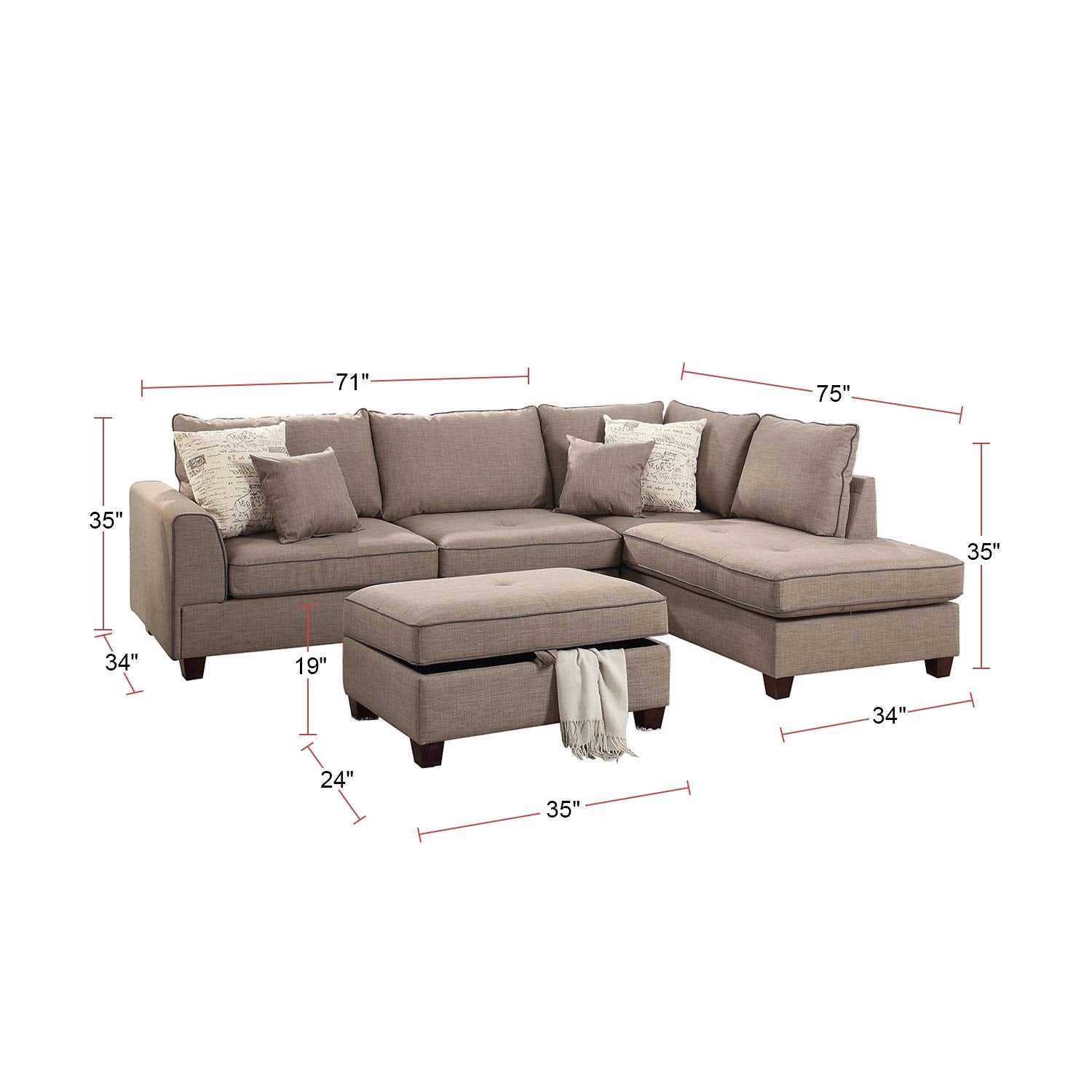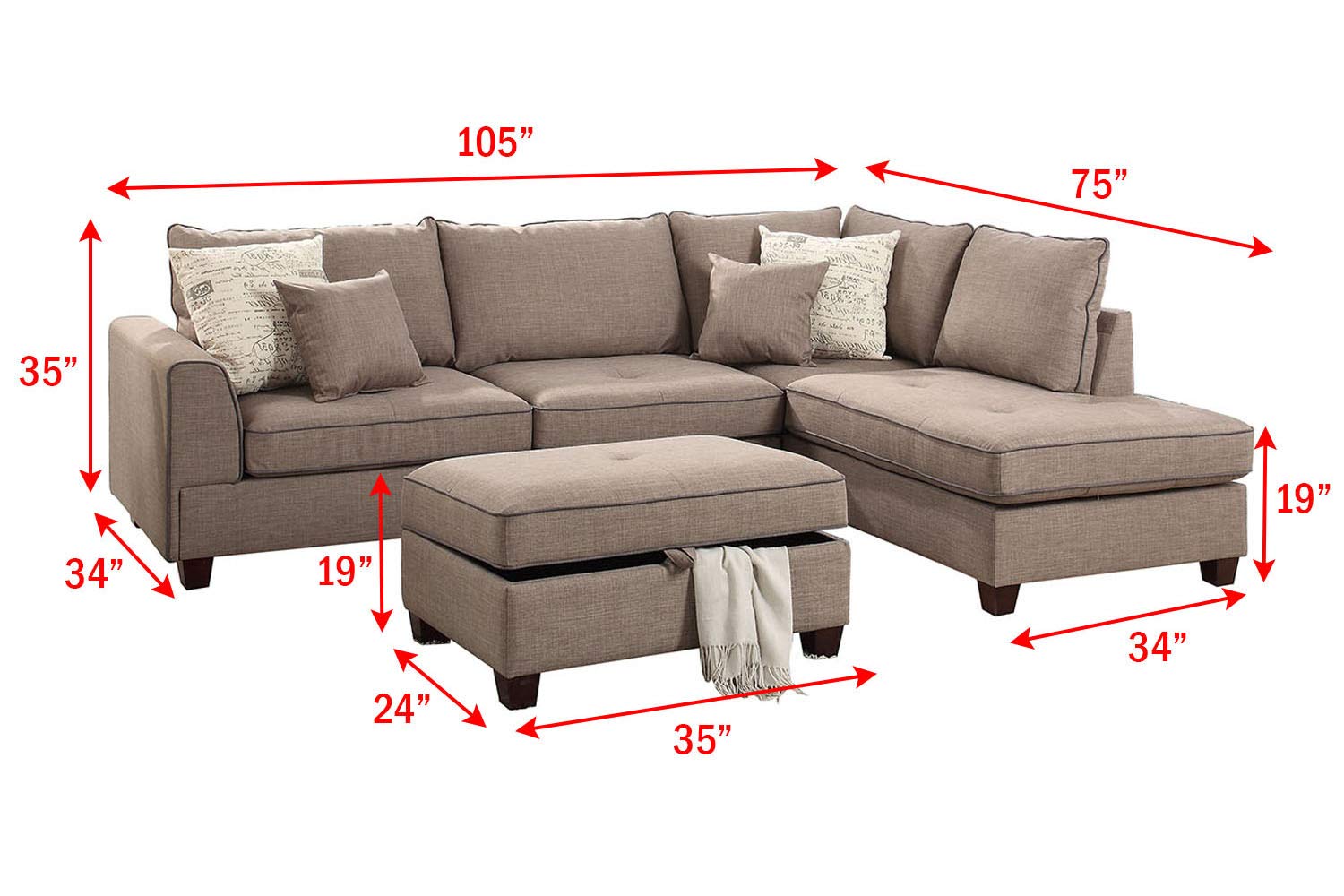 - U.S. Patented reversible design allowing this sectional to be Set up Chaise on the left or right configuration. Dimensions : Reversible L/R Chaise: 75" x 34" x 35"H ; Sofa: 70" x 34" x 35"H Ottoman: 35" x 24" x 19"H
