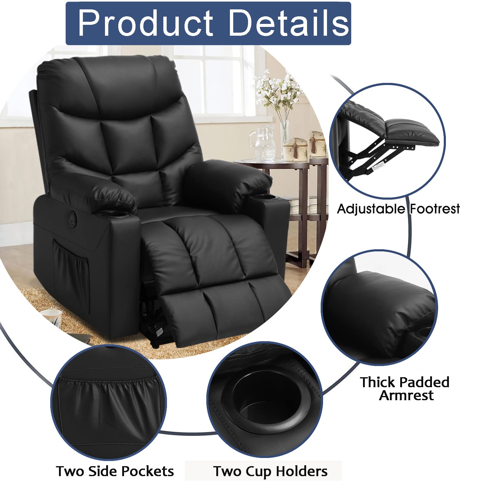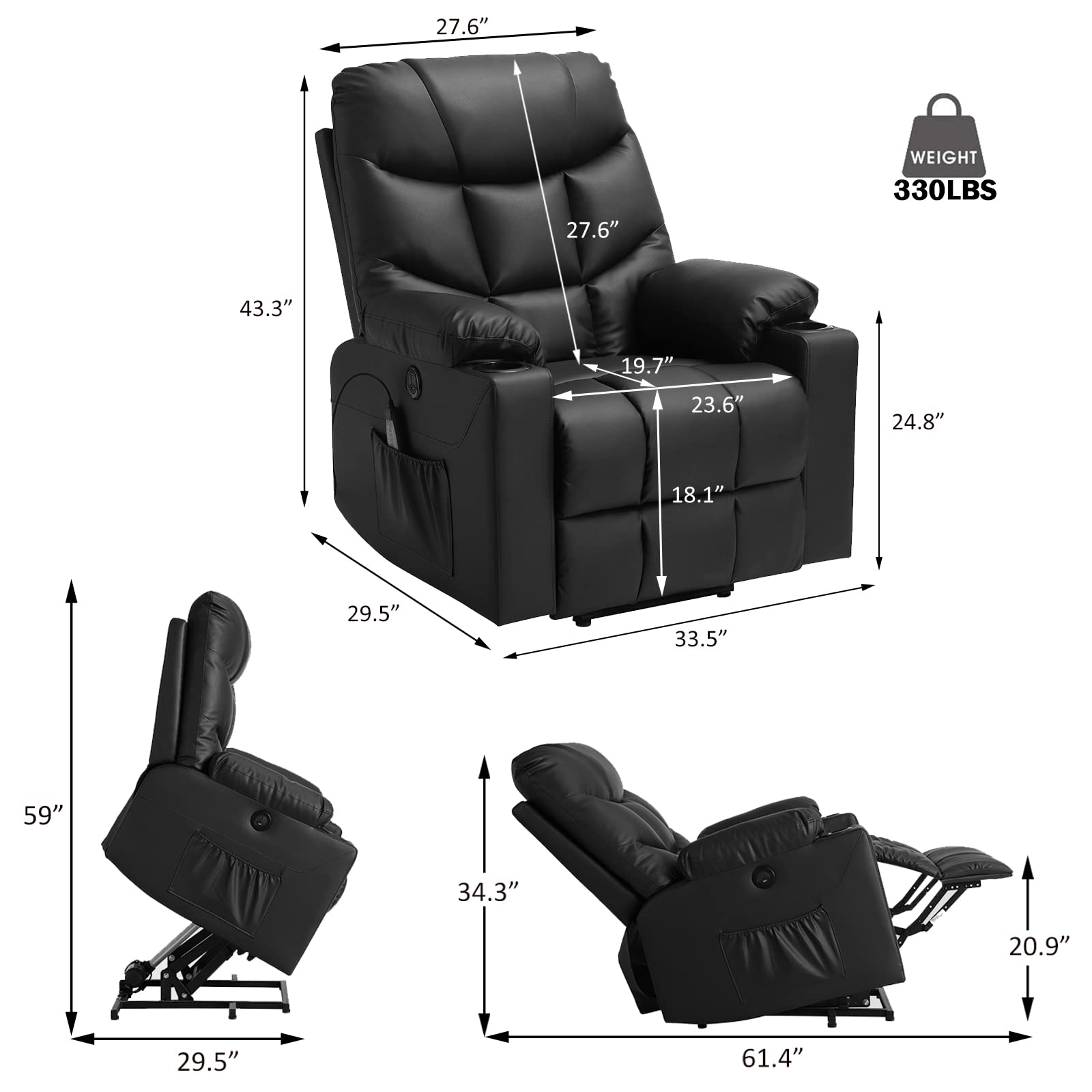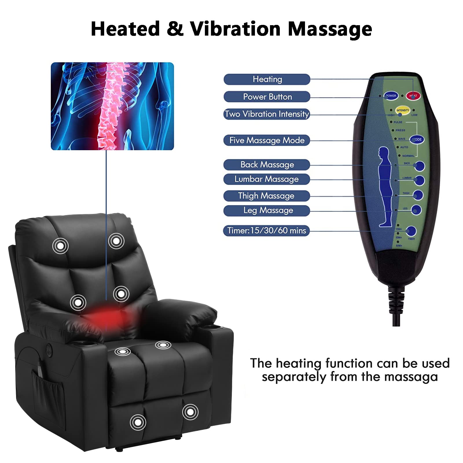 - Massage and Heating This power lift recliner chair with four points massage (back, lumbar, thigh, leg) with five adjustable modes and two intensity options, offers you a full body massage at your own home. Backrest with lumbar heating function, will give extra comfort and helping to improve chronic lumbar diseases. There is a timer function in 15/30/60 minutes which is convenient for you to set massaging time.