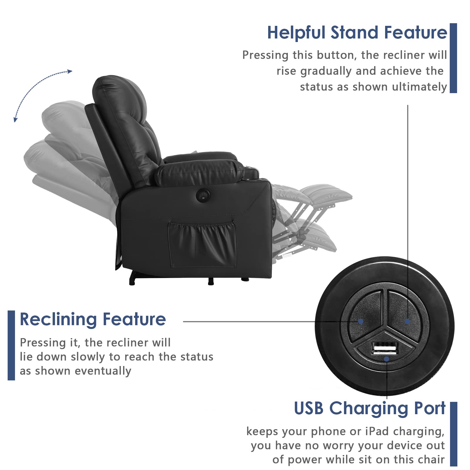 - Safety and User-friendly All wood boards used in this power lift recliner are formaldehyde-free. Two extra side storage bags to hold remote controls, magazines and so on, great for watching TV, reading and napping. The power recliner chair also with USB charging function on the white remote control, allow you to charge your devices(Mobile Phone, iPad) during you sitting or reclining.