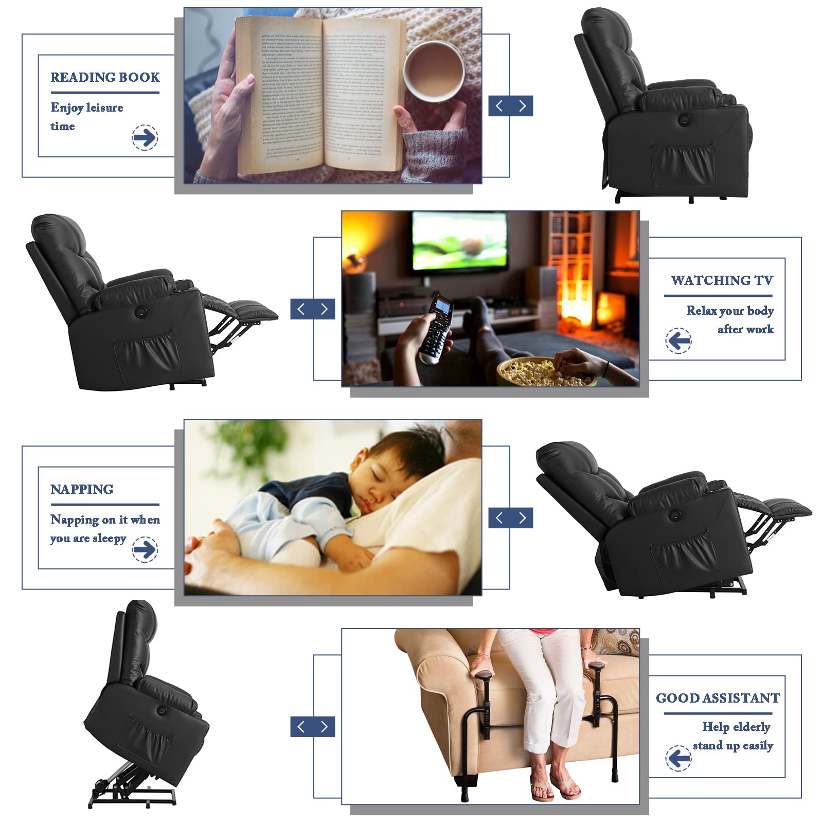 - Good Assistant Power Lift Recliner The power lift recliner chair provides comfortable seating and assistance for those who may need a little help getting out of their seat. Controlled by a side button to help the sick, senior or elderly people to stand up easily without putting pressure on their backs or knees, smoothly adjust to lifting or reclining position you want. If you are looking for a gift for your parents, it's a nice choice for family on Mother's Day, Christmas, New Year days, ect.